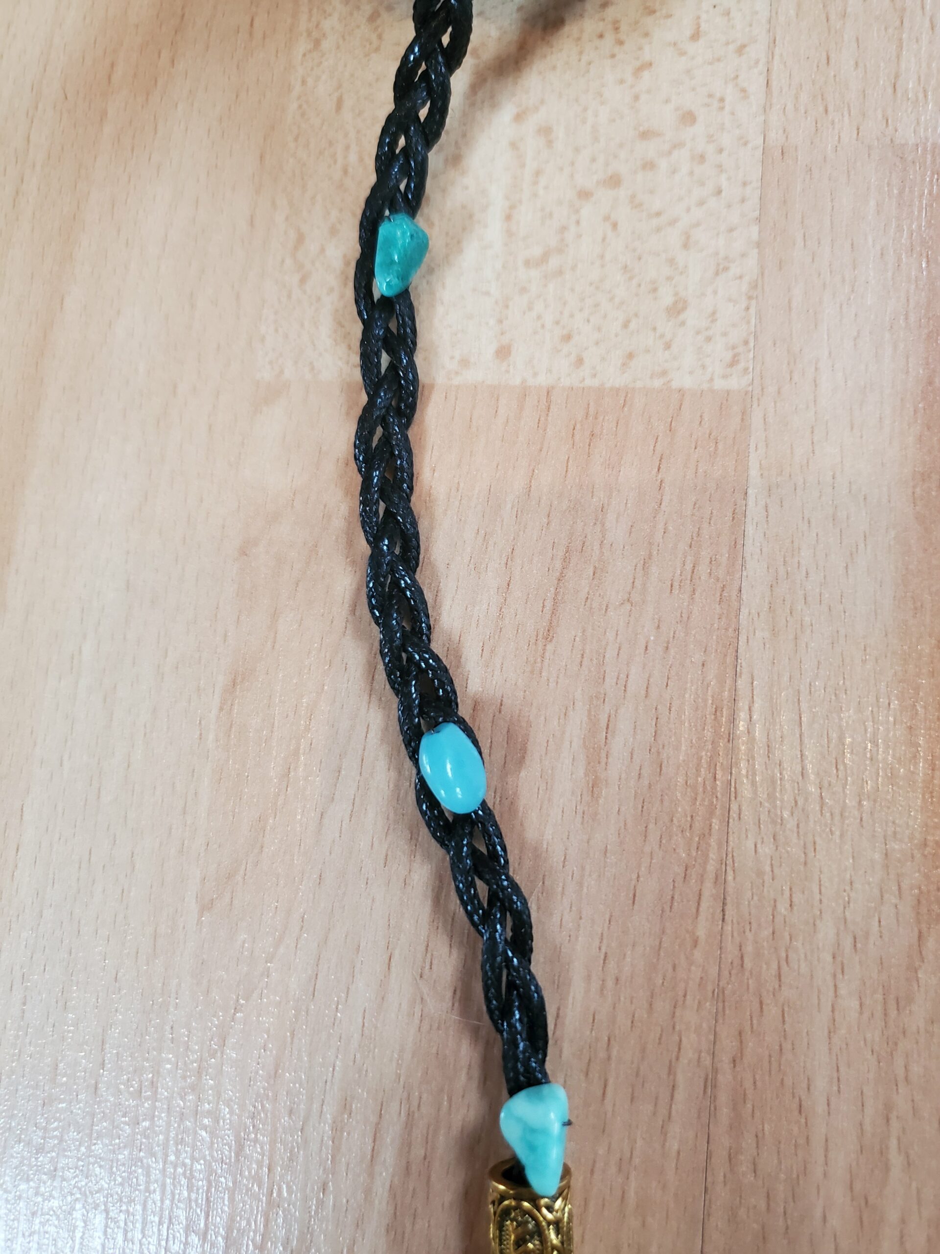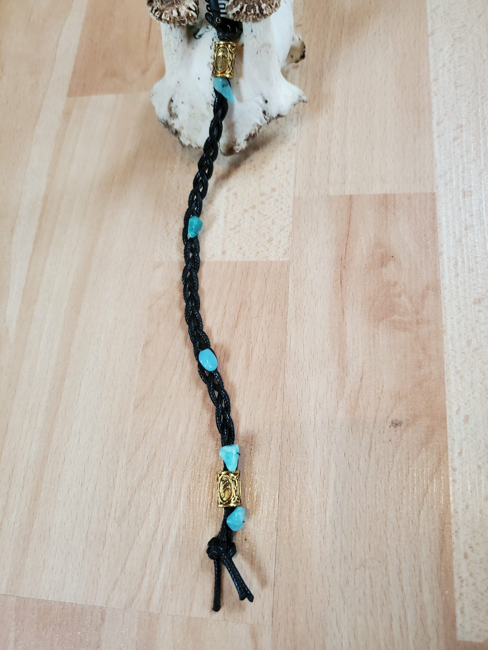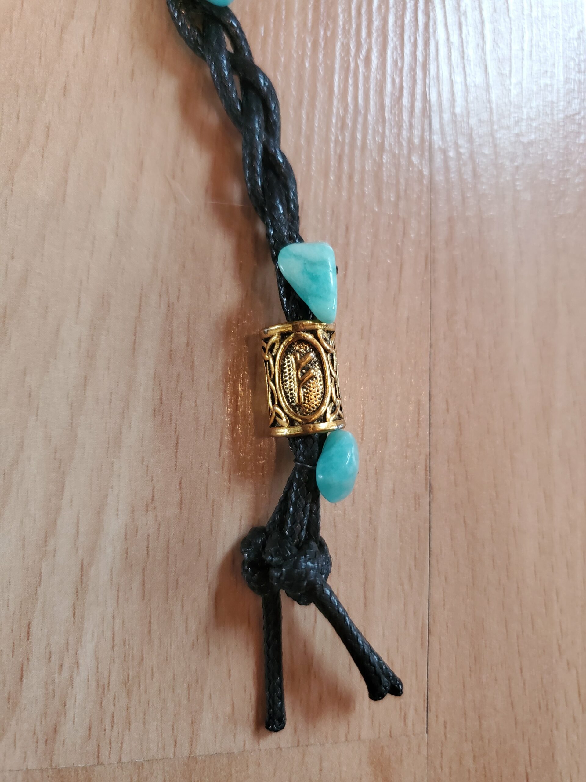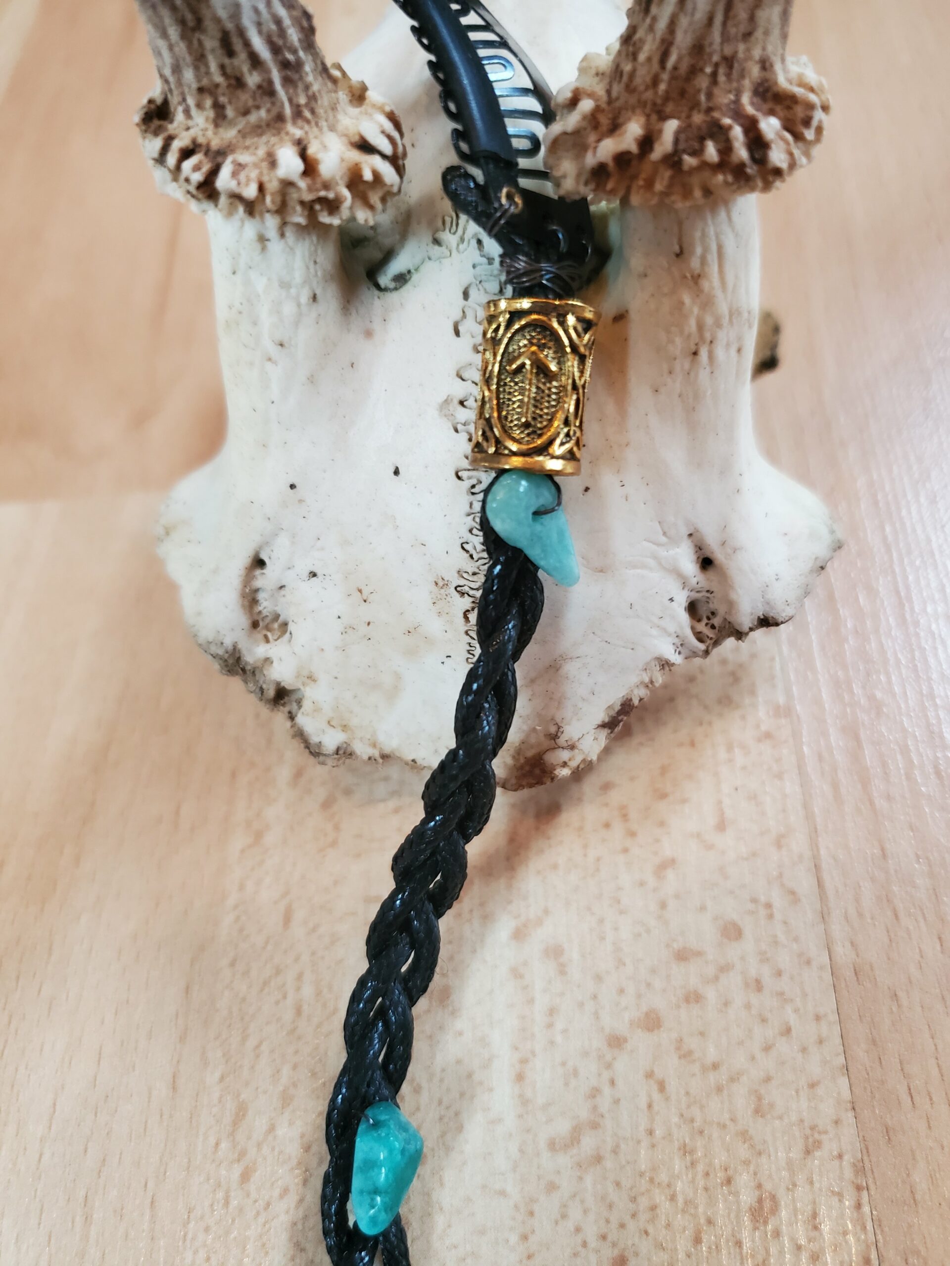 Bijou capillaire d’Abriel est fait par mes soins avec un cordon de couleur noir, de l’Amazonite et des runes: