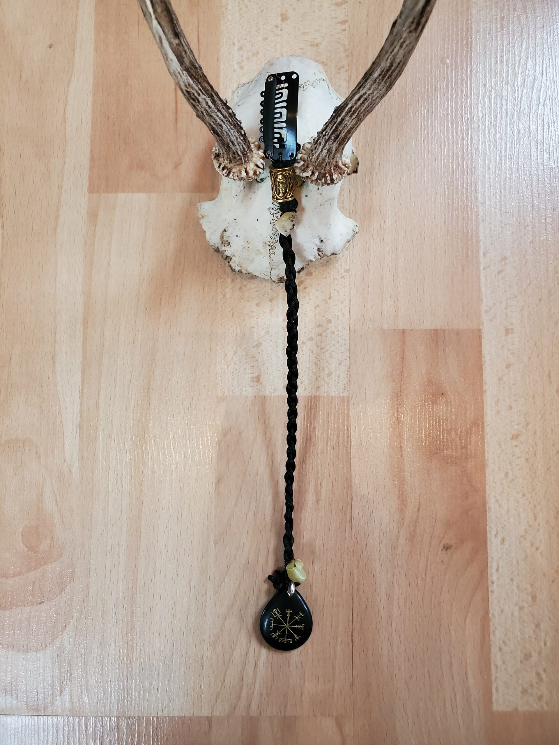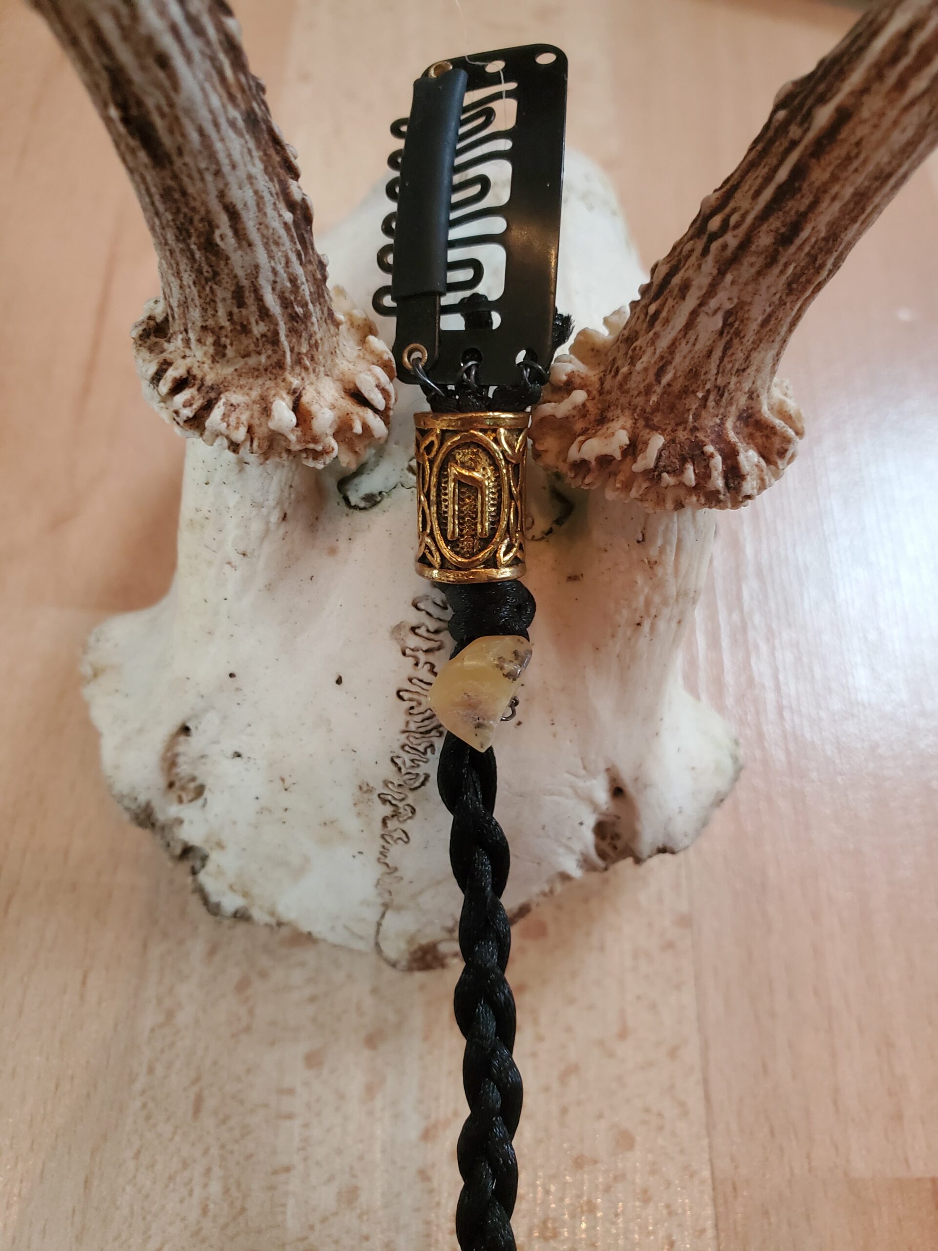 Bijou capillaire d’Isabeau est fait par mes soins avec un cordon de couleur noir, d’Opale Jaune, de rune et d’un Vegvisir