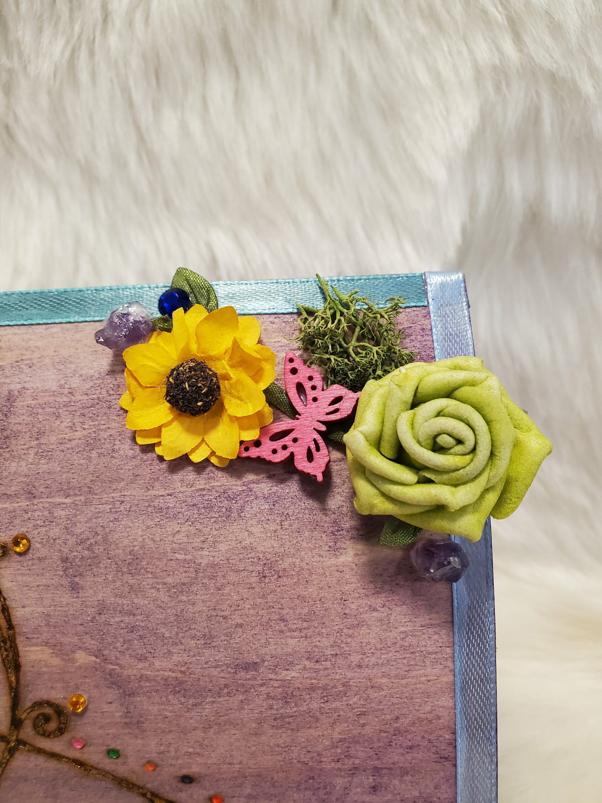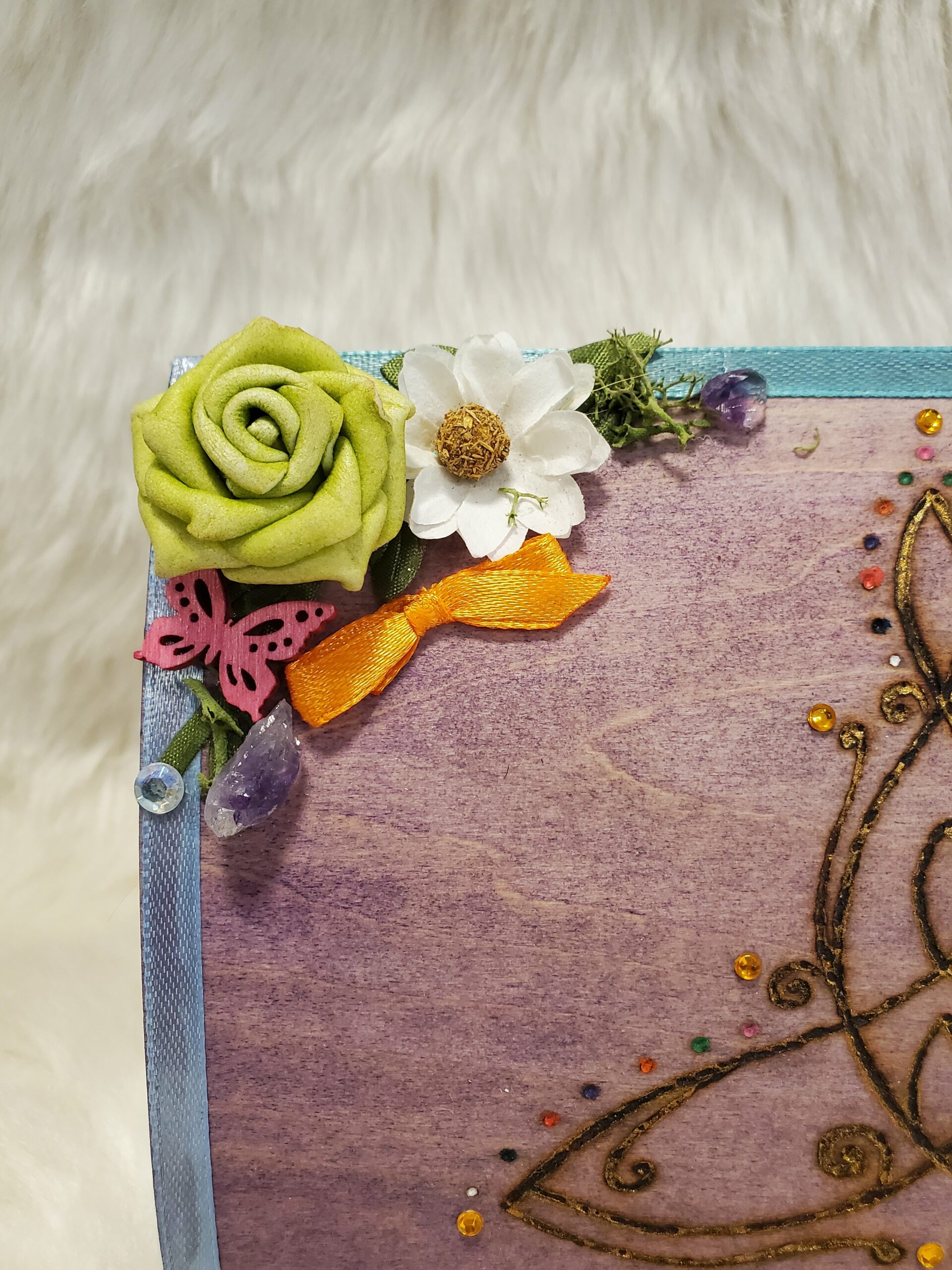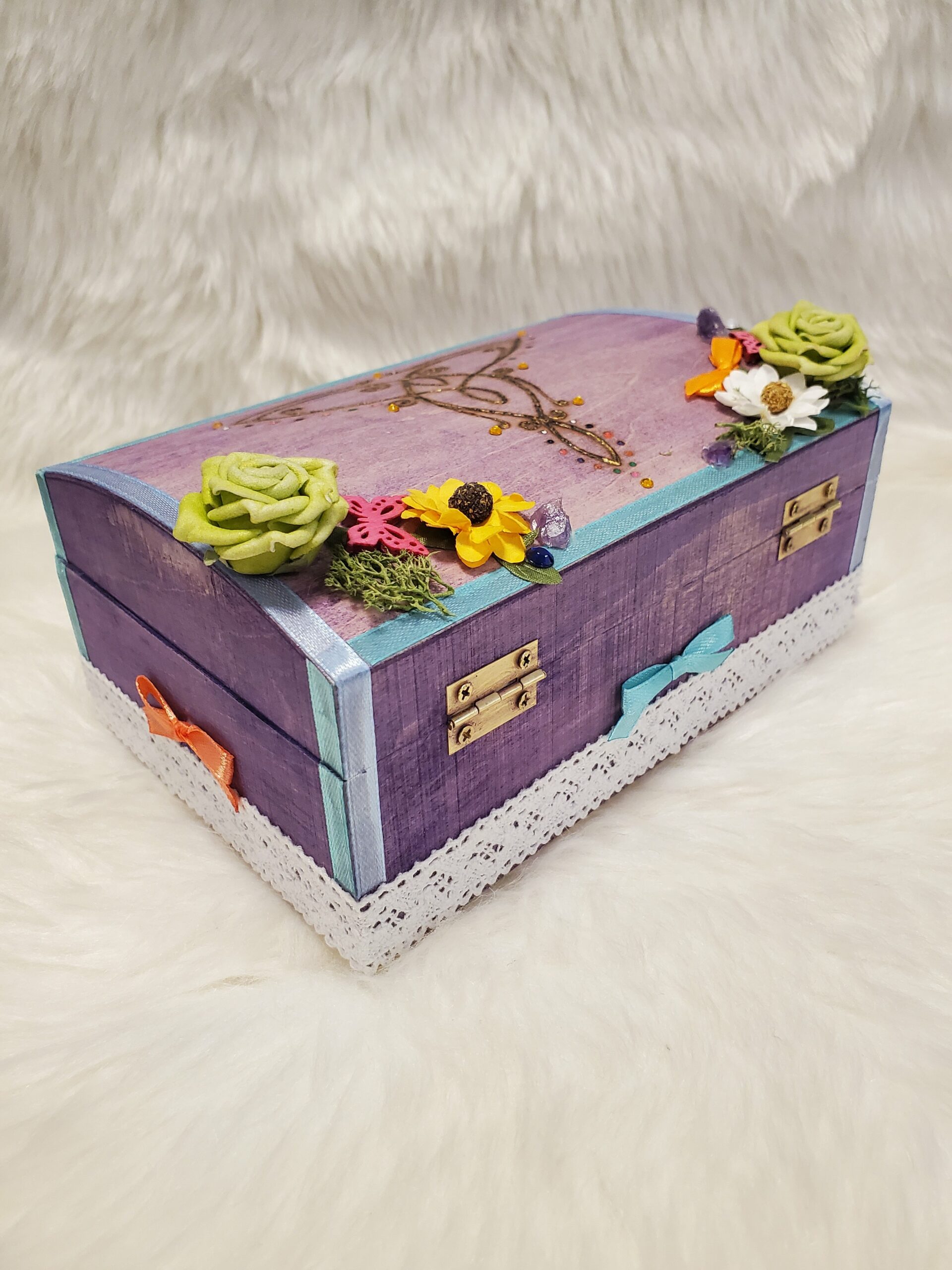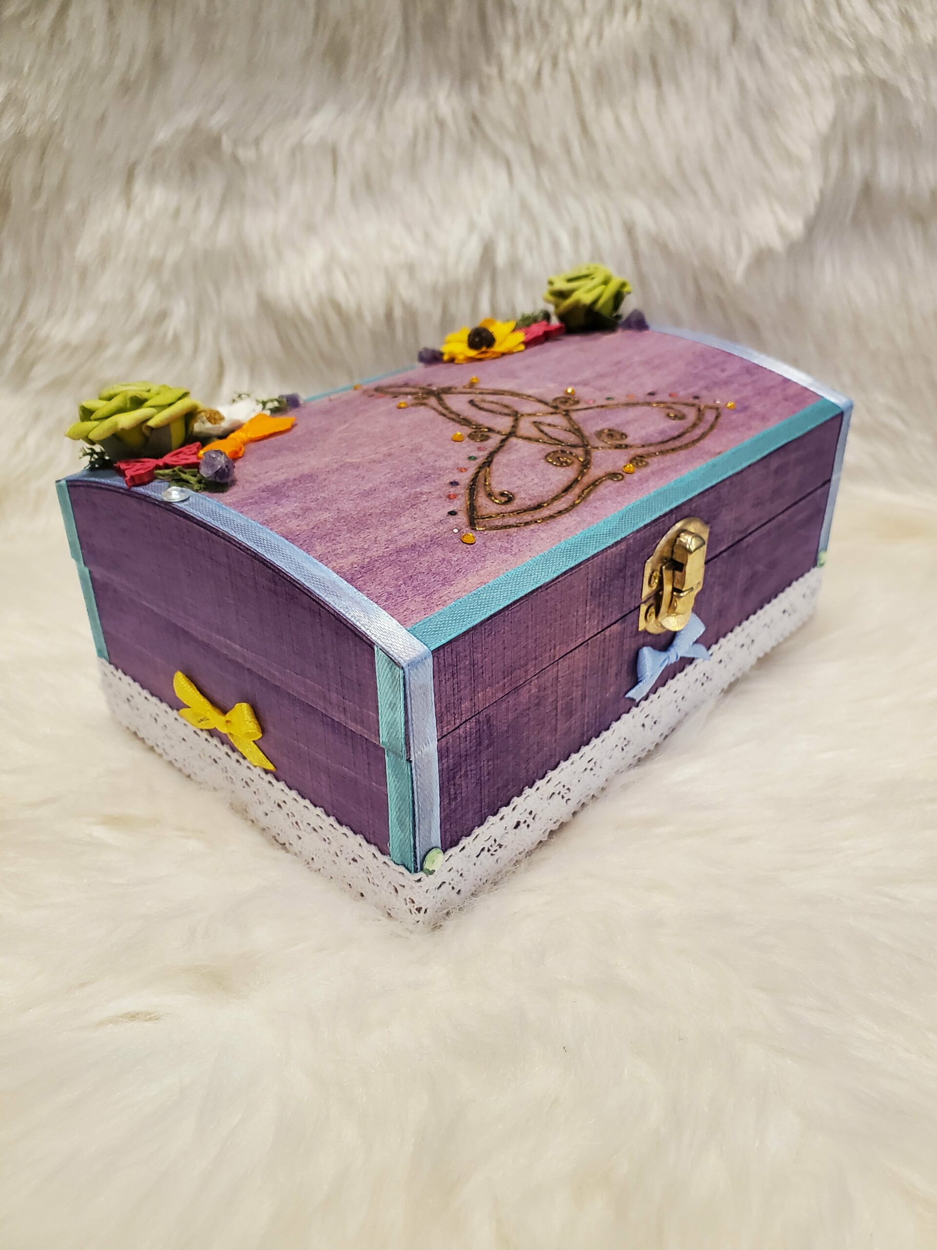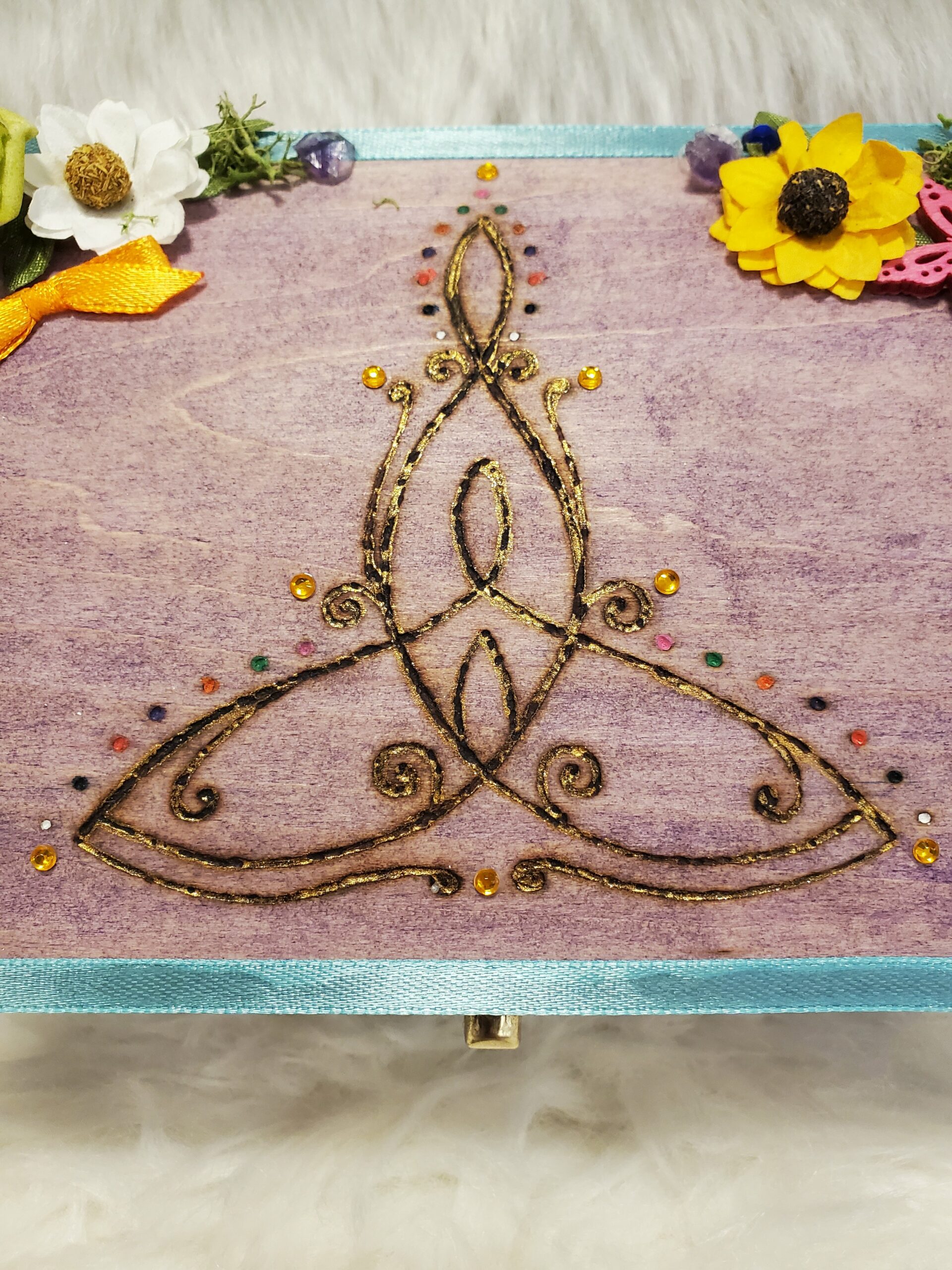 Boîte de protection en bois, peinte, gravée, décorée avec de l’Améthyste et des fleurs séchées puis vernie.
