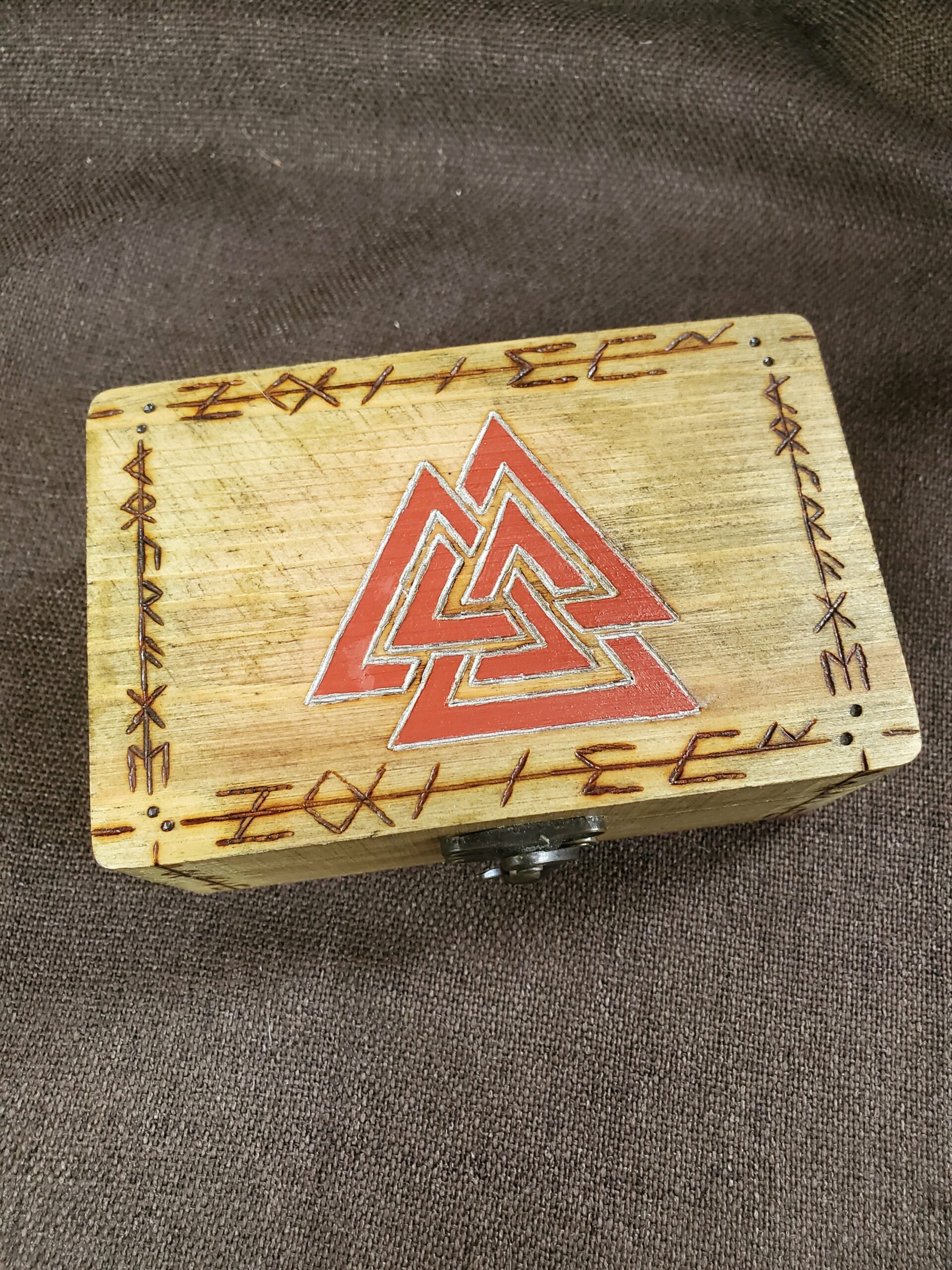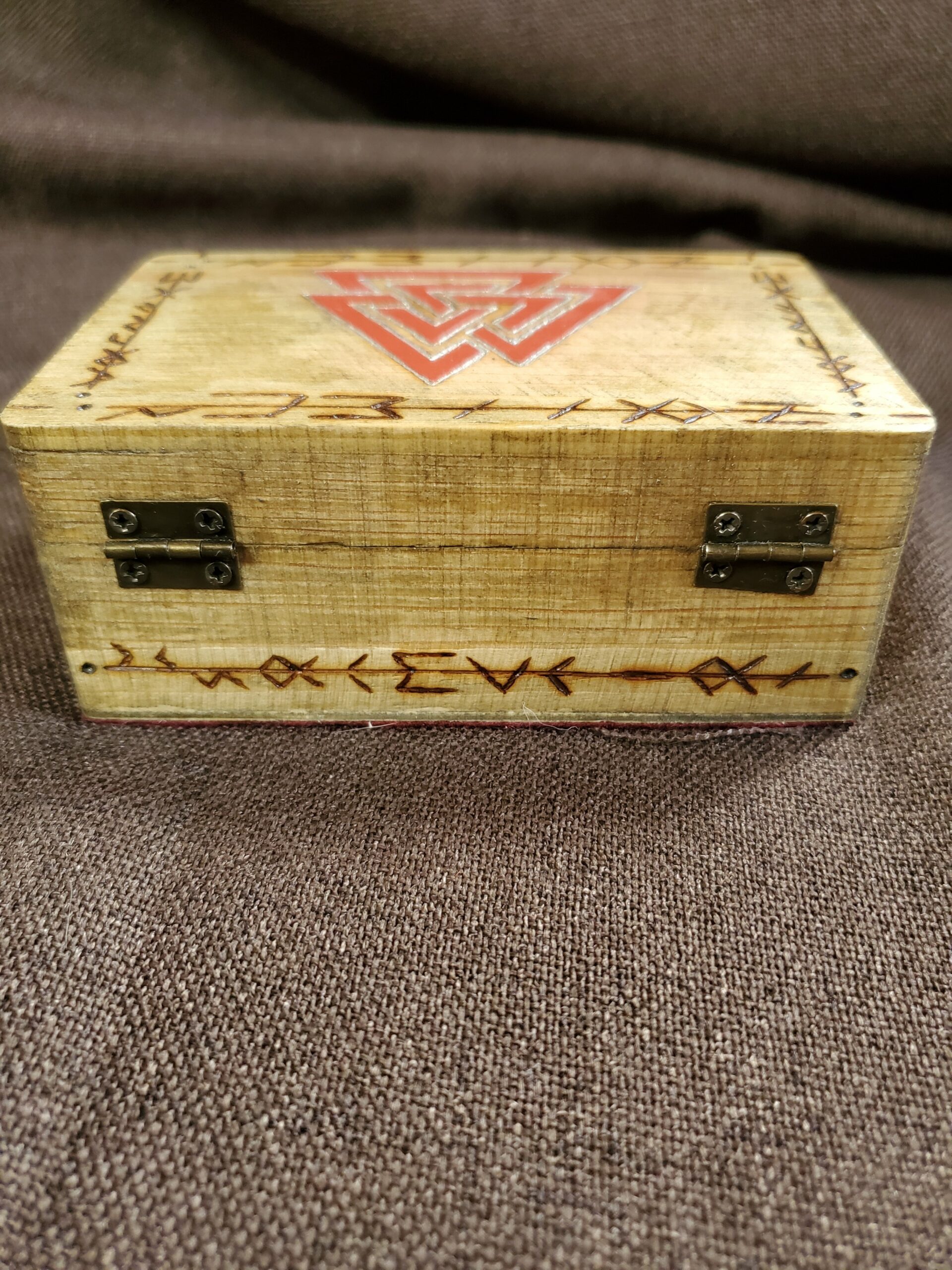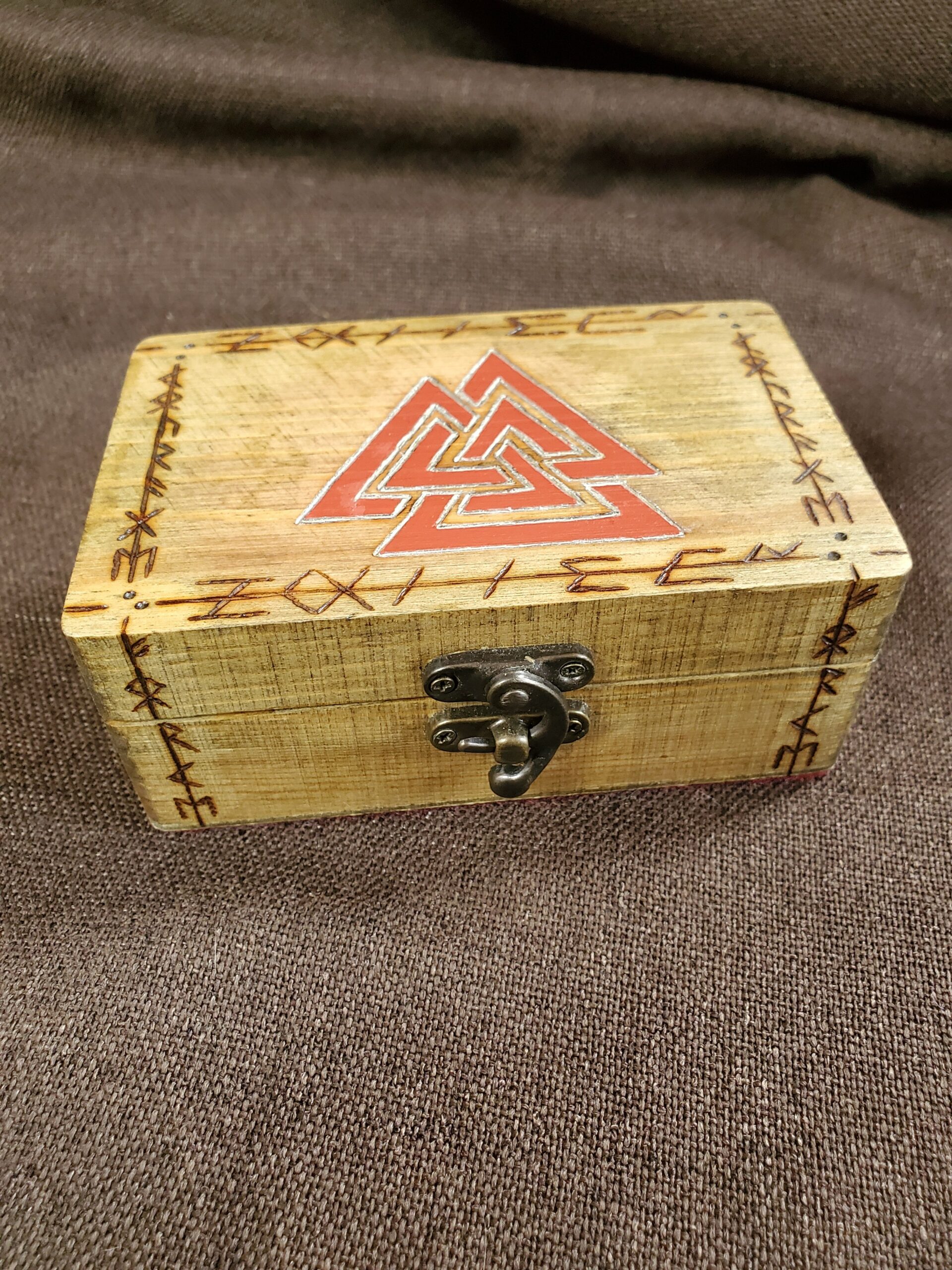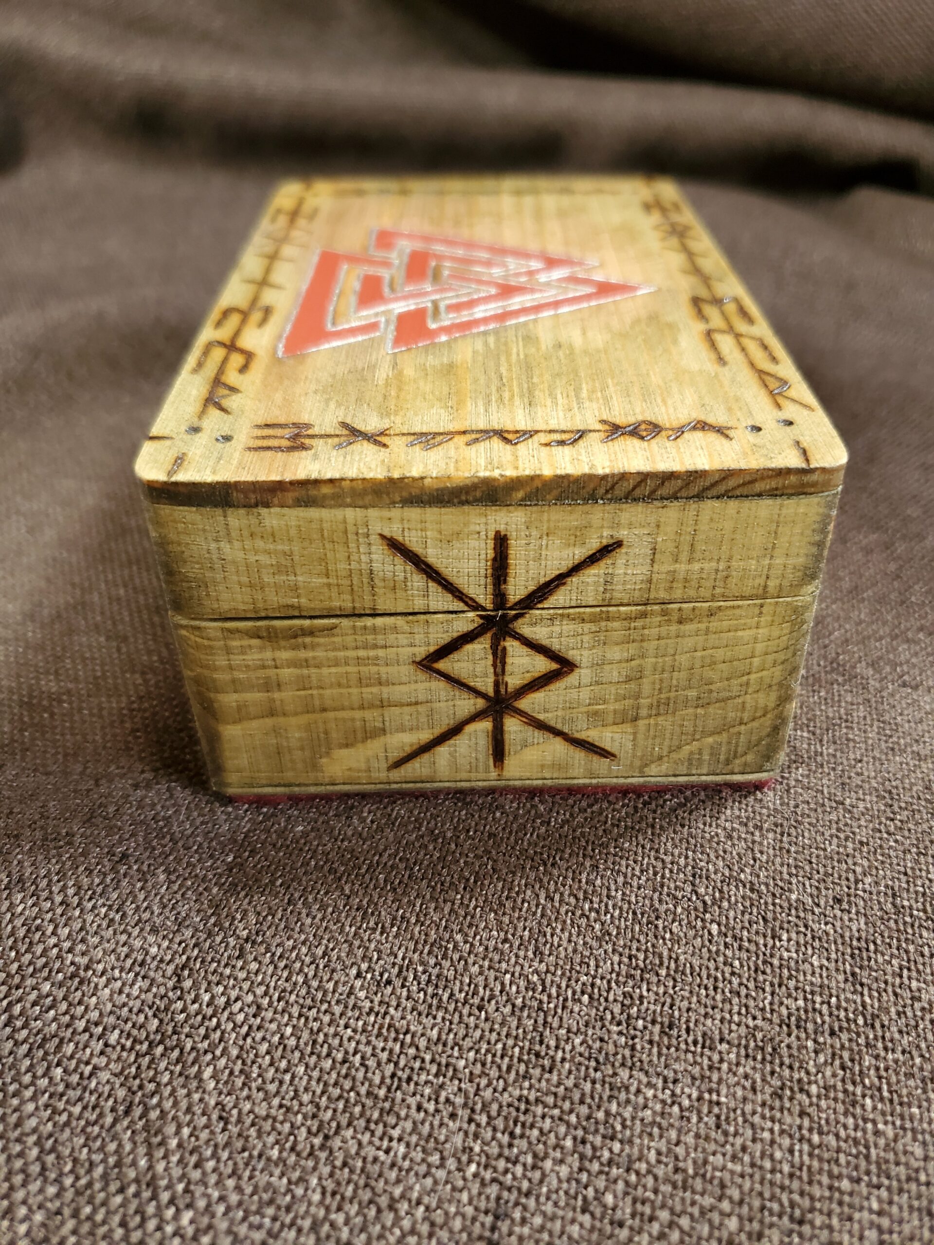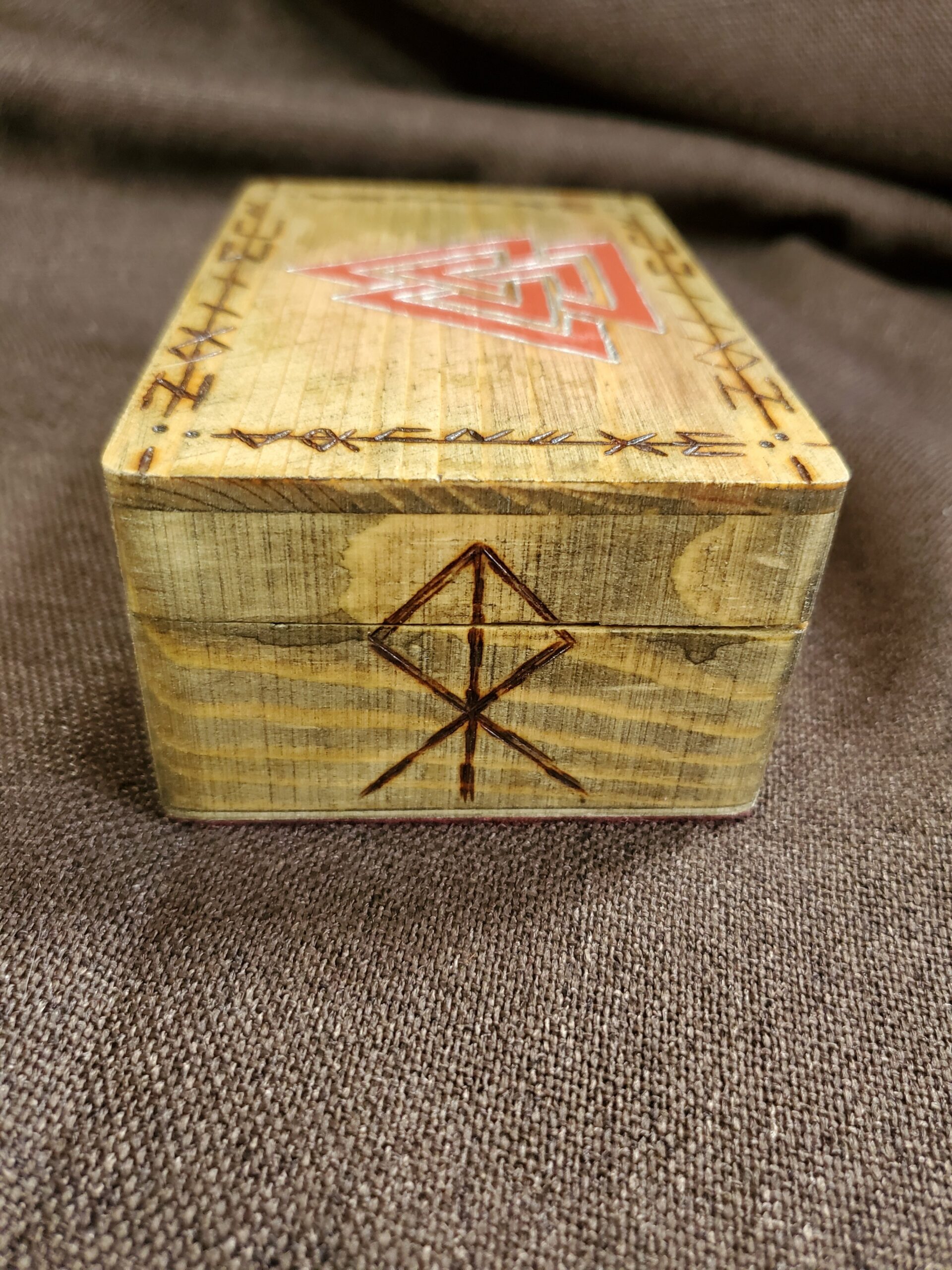 Boite gravée de runes, de Bindrune et d’un Valknut.