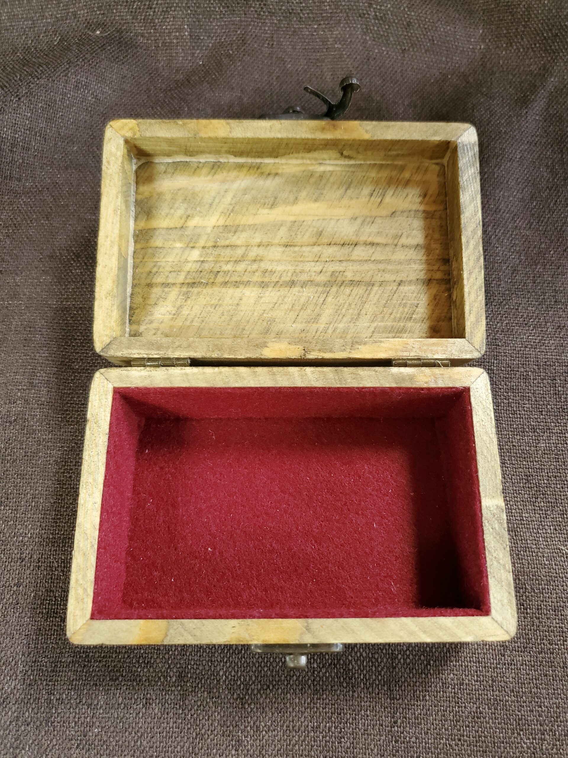 Boîte de protection viking en bois lasurée, gravée et verni. Intérieur en feutrine.