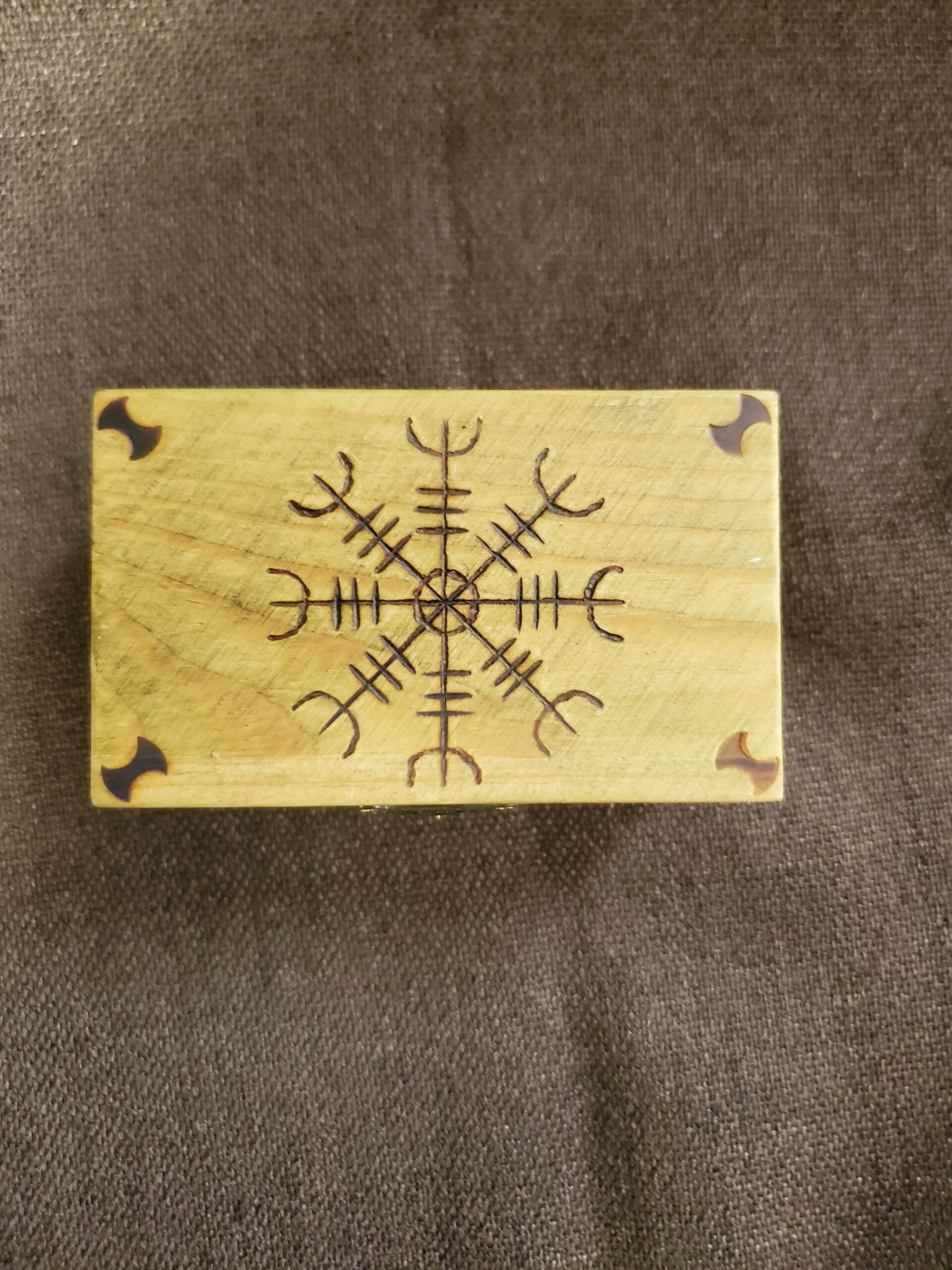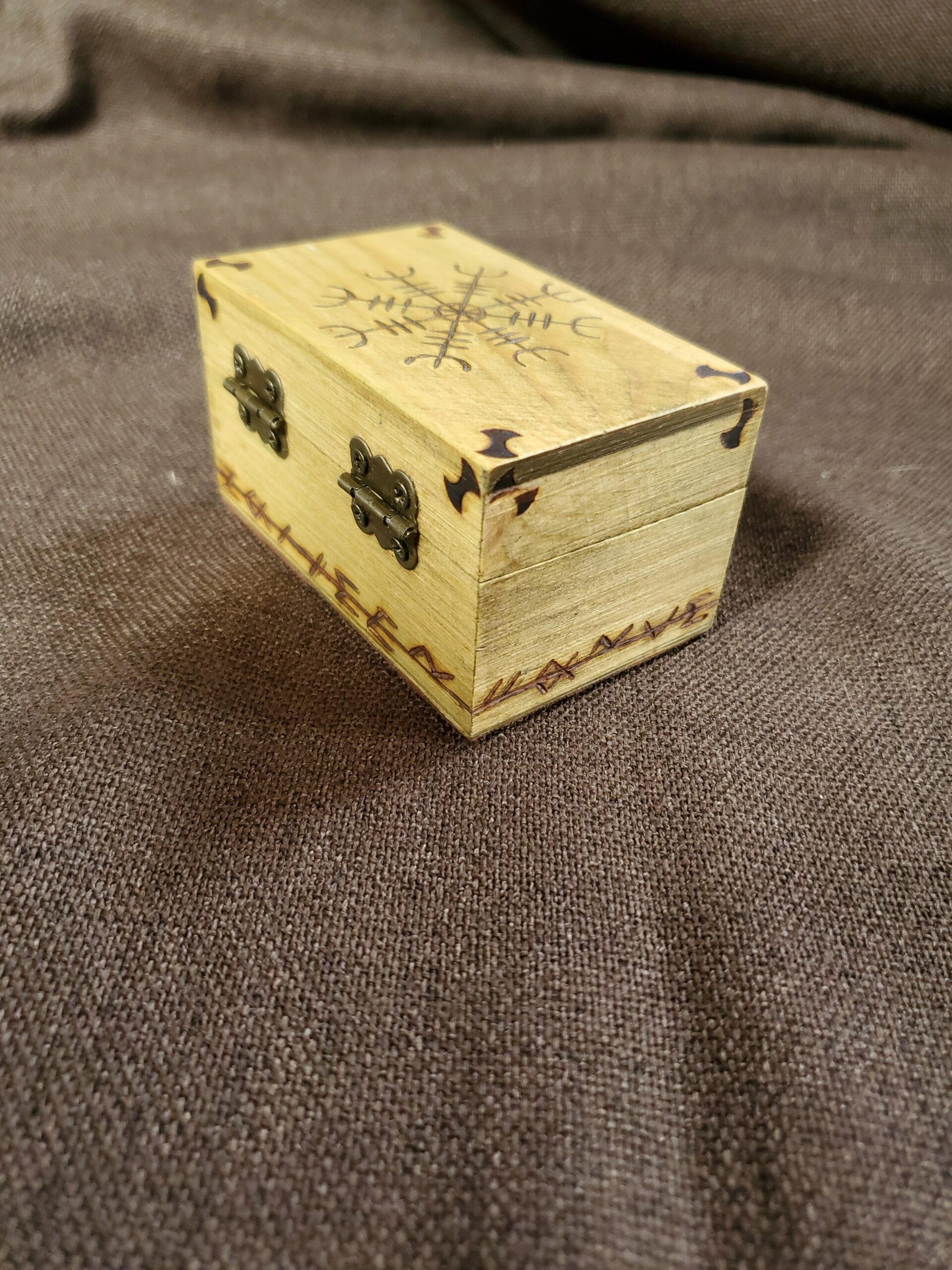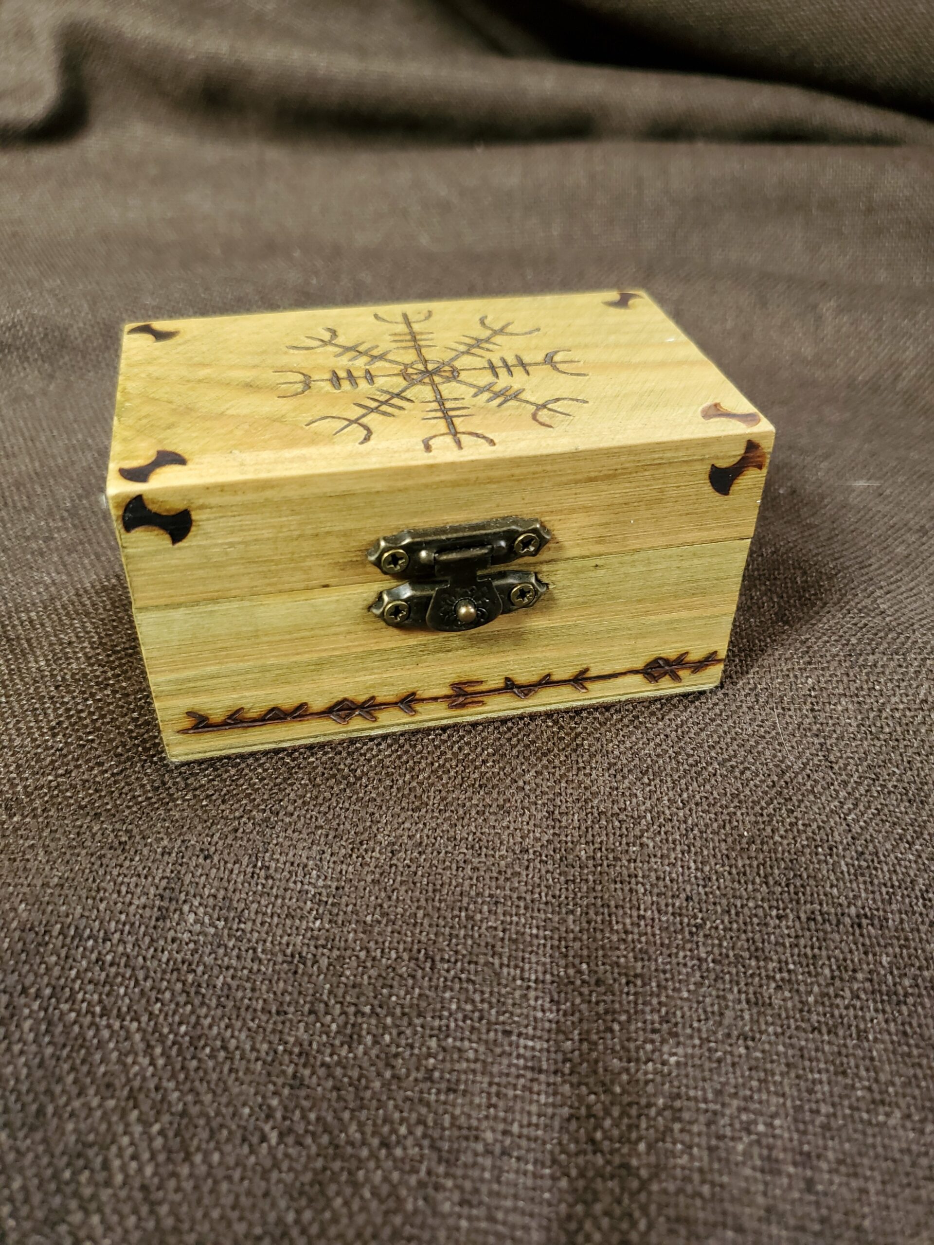 Boîte de protection viking en bois peint, gravé et verni. Intérieur en feutrine.