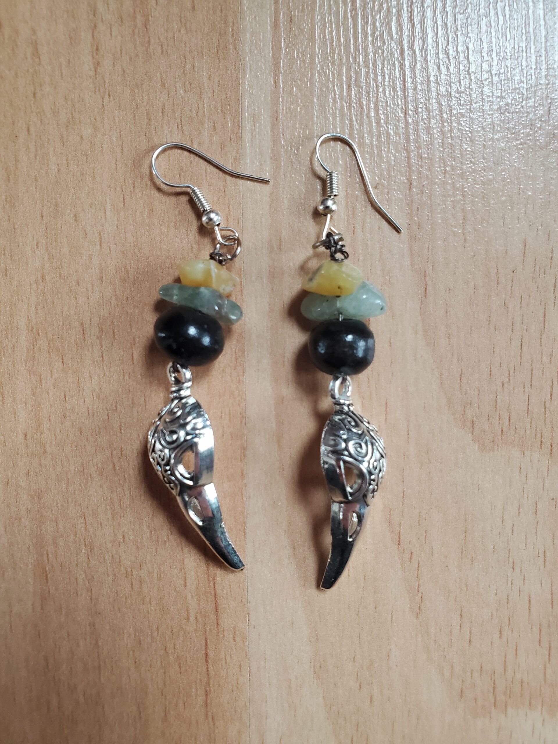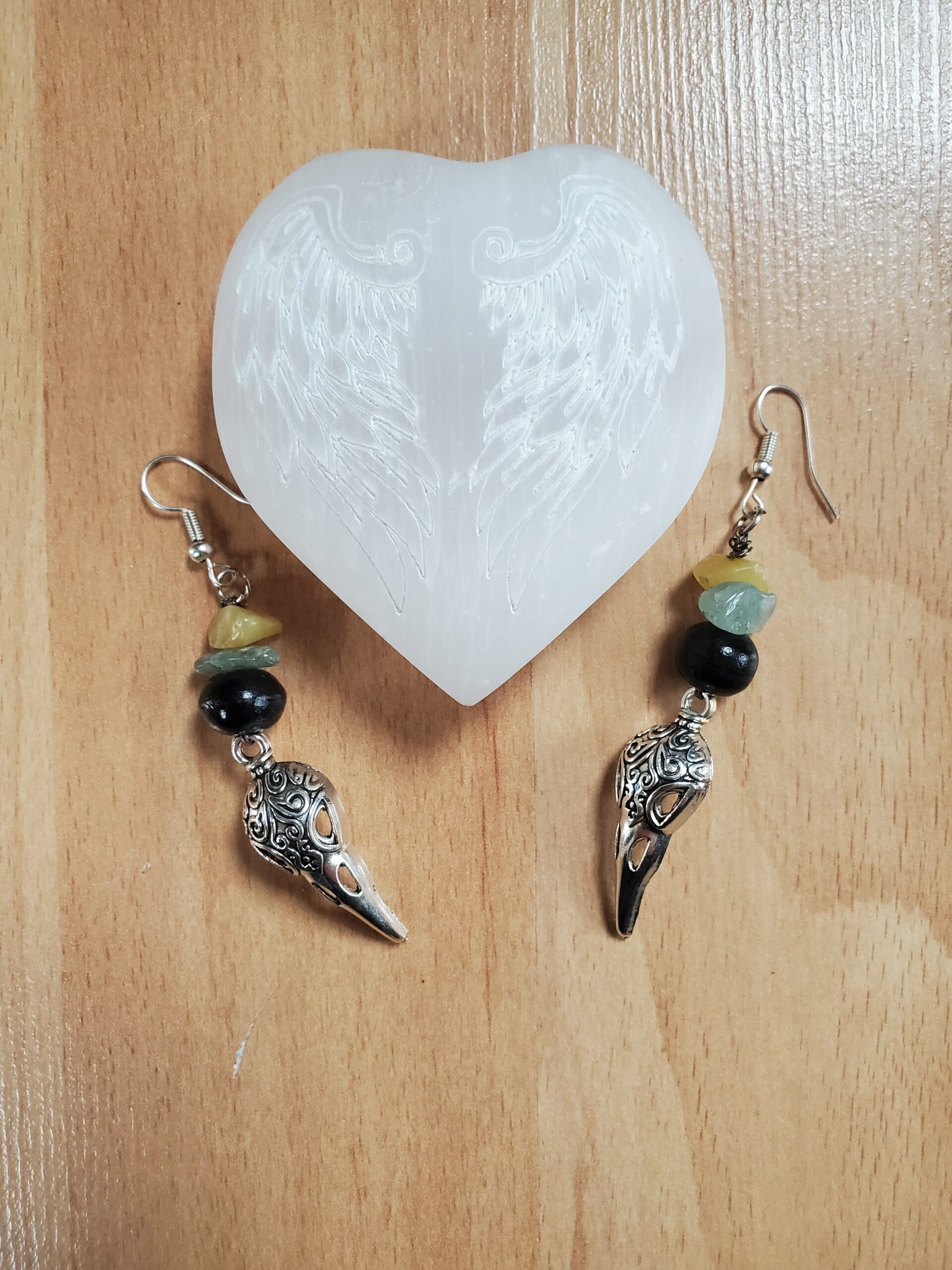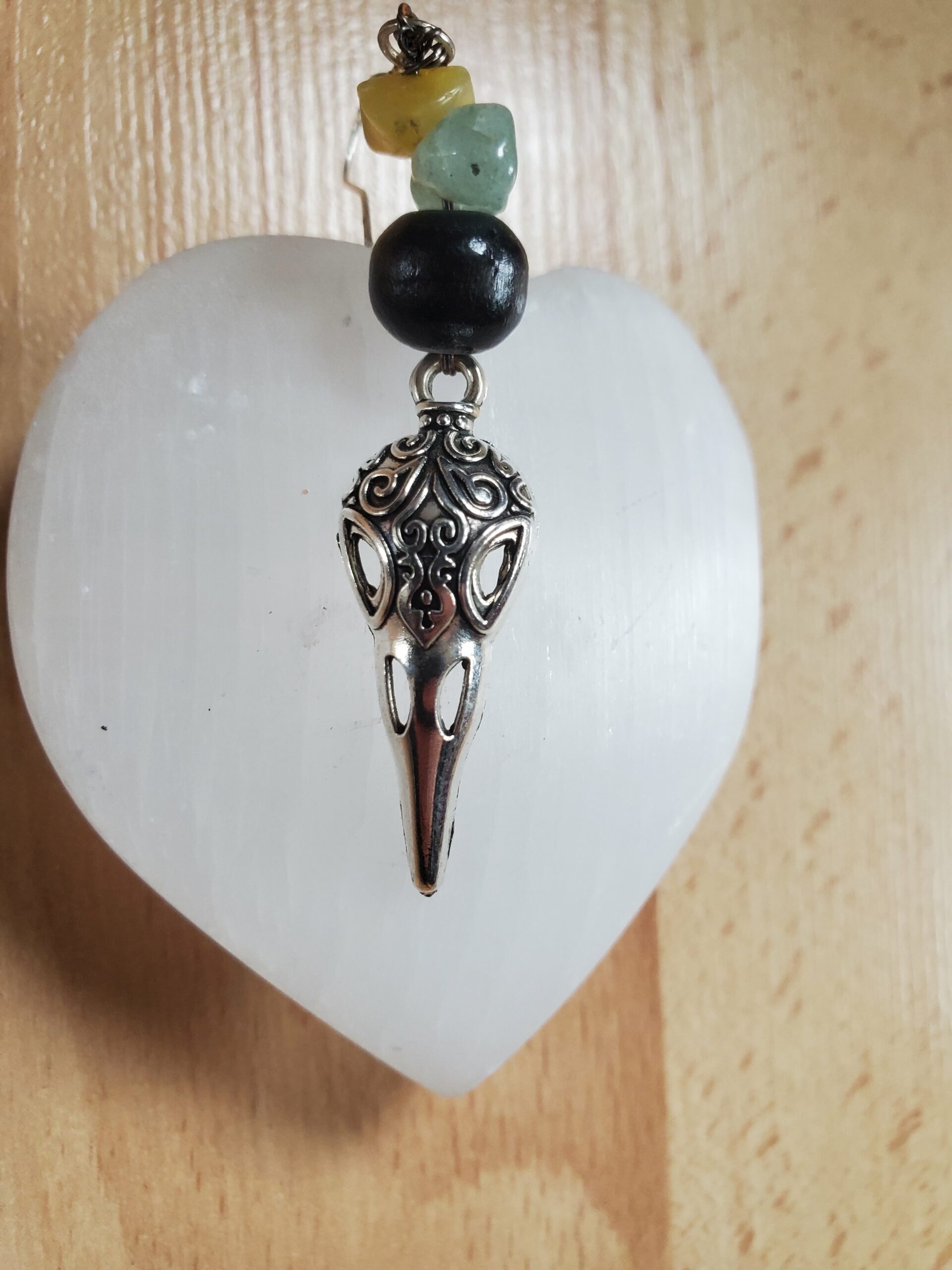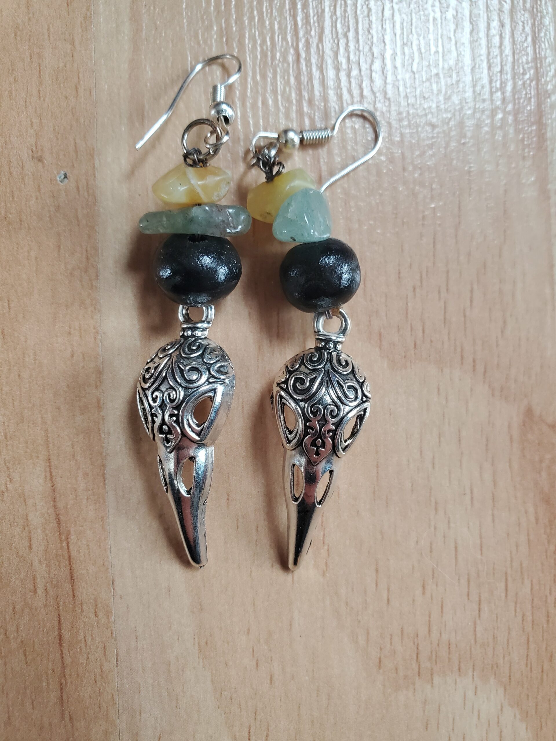 Elles sont composée de perles en bois, d’Amazonite, d’Opale jaune, de lunes et de crânes de corbeau.