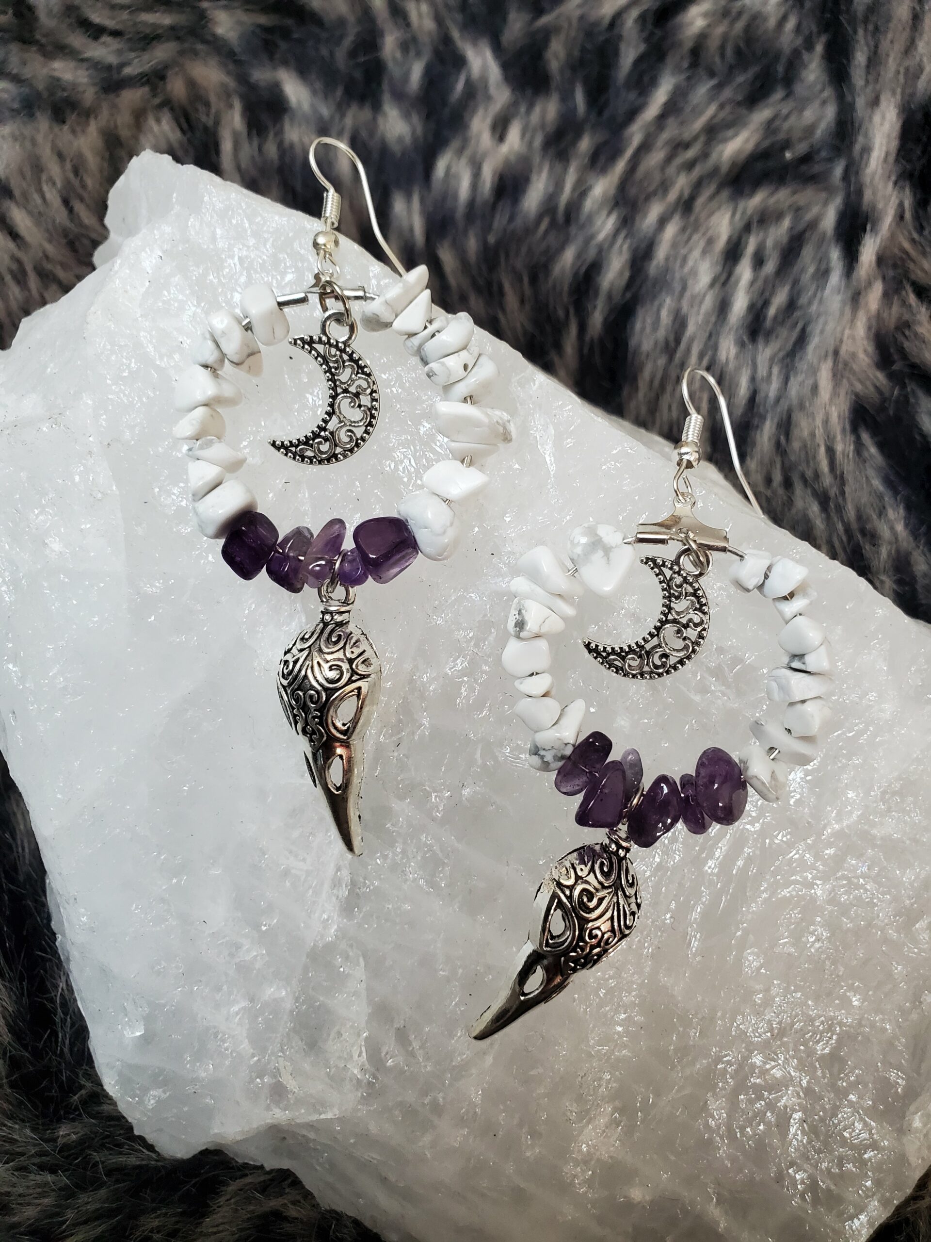 Elles sont faites en Howlite, Améthyste, lune et crânes de corbeau.