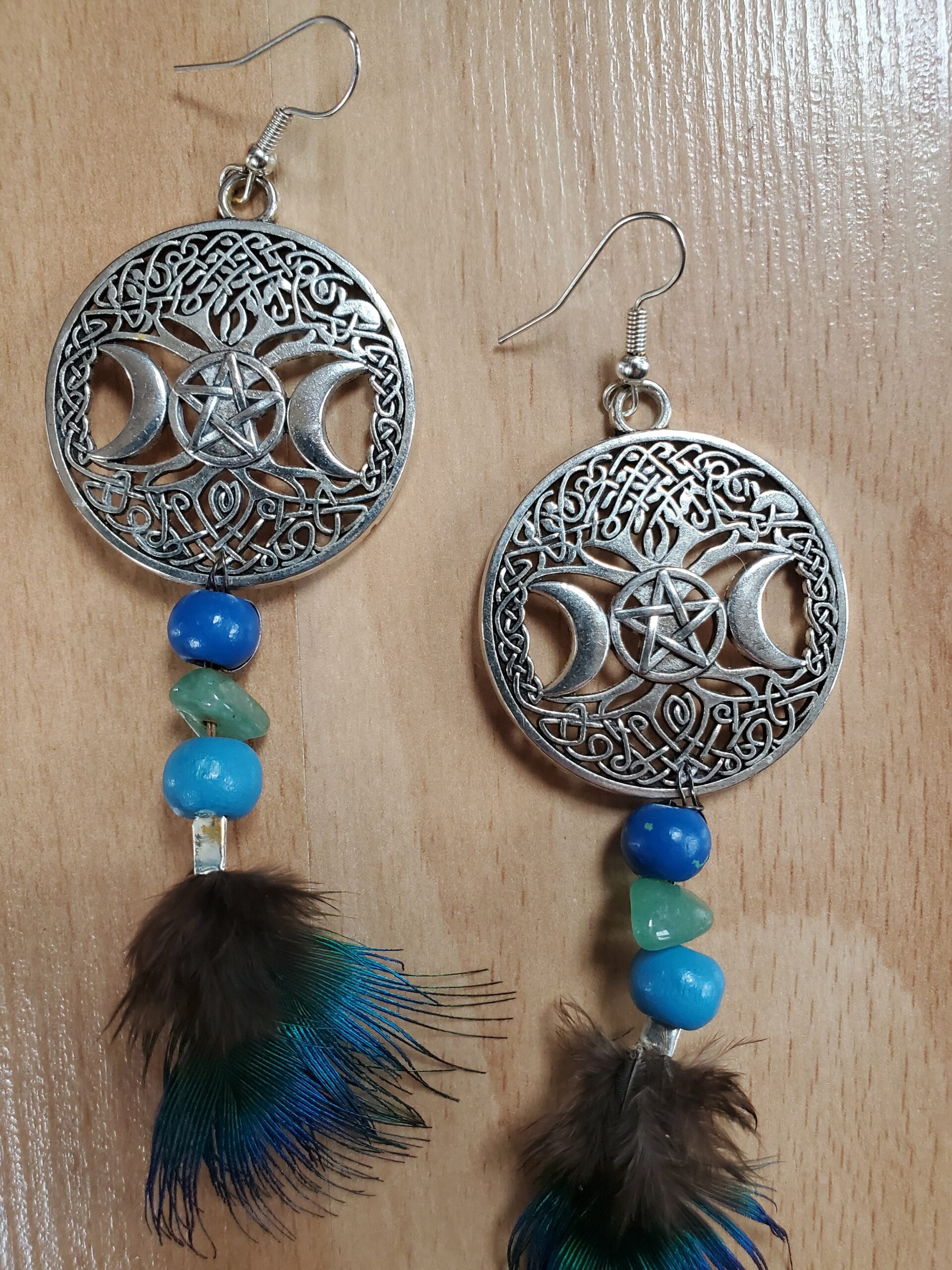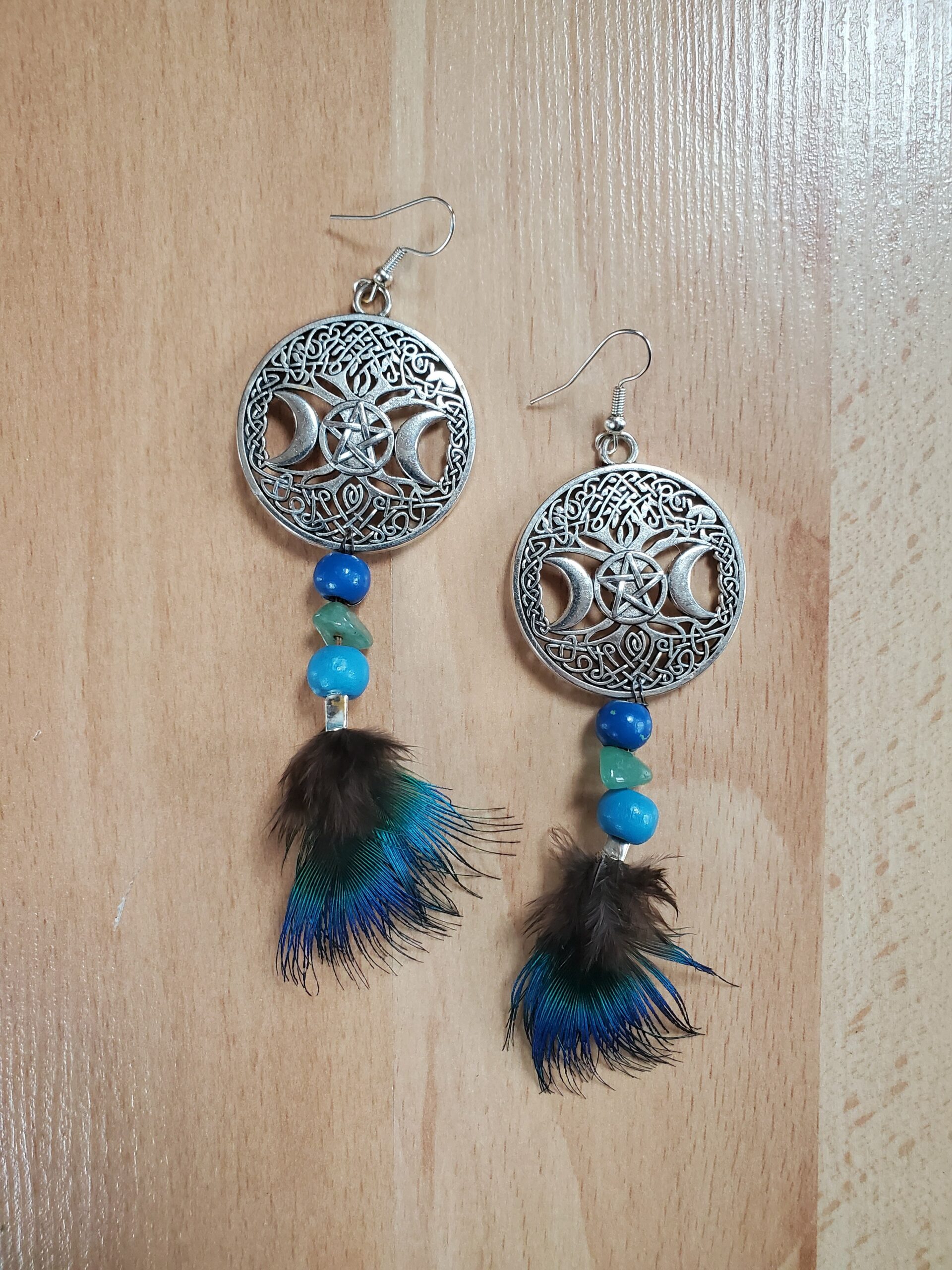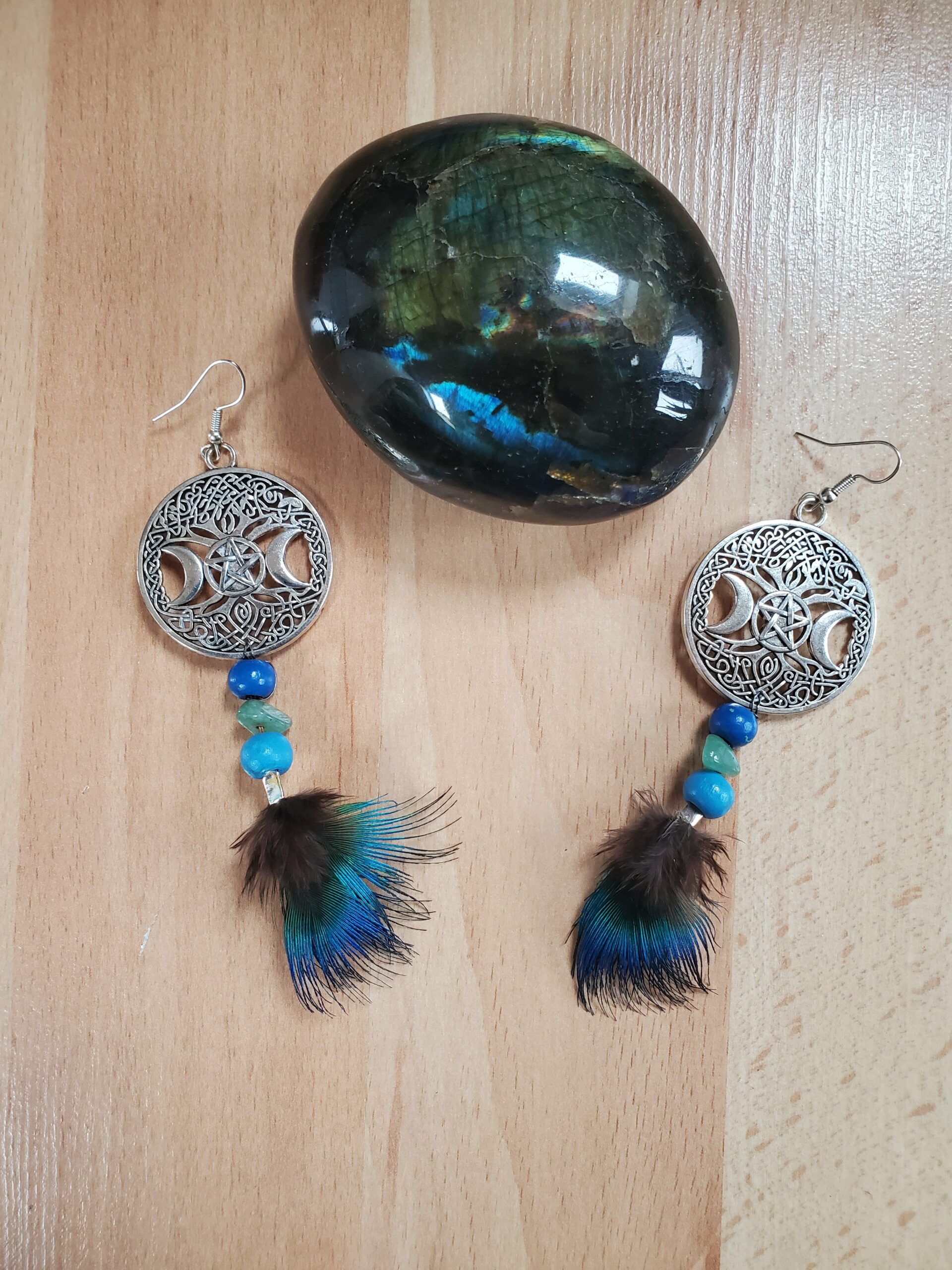 Elles sont composées de perles en bois, d’Amazonite, de plumes de paon et de symboles de protection puissants.