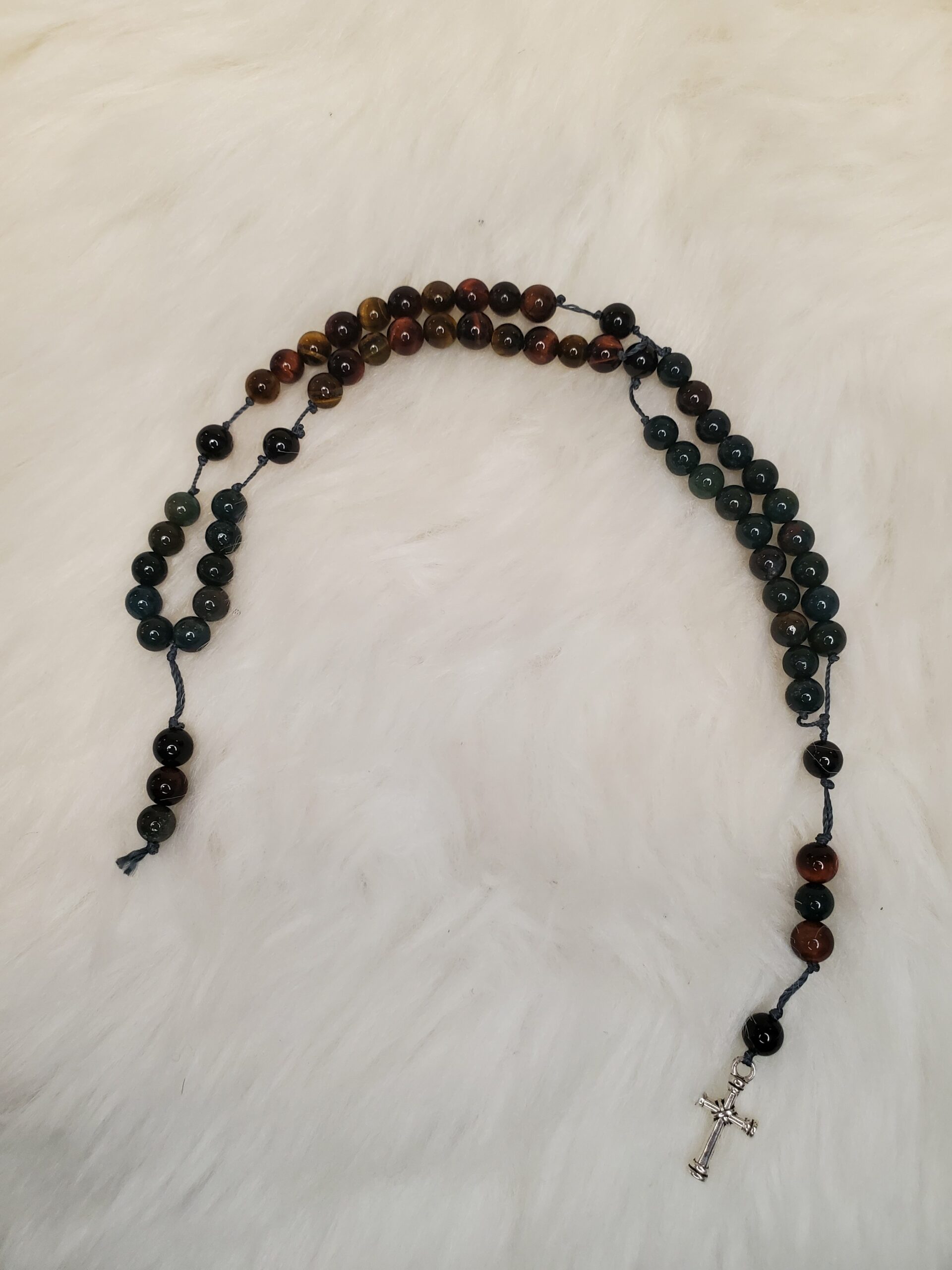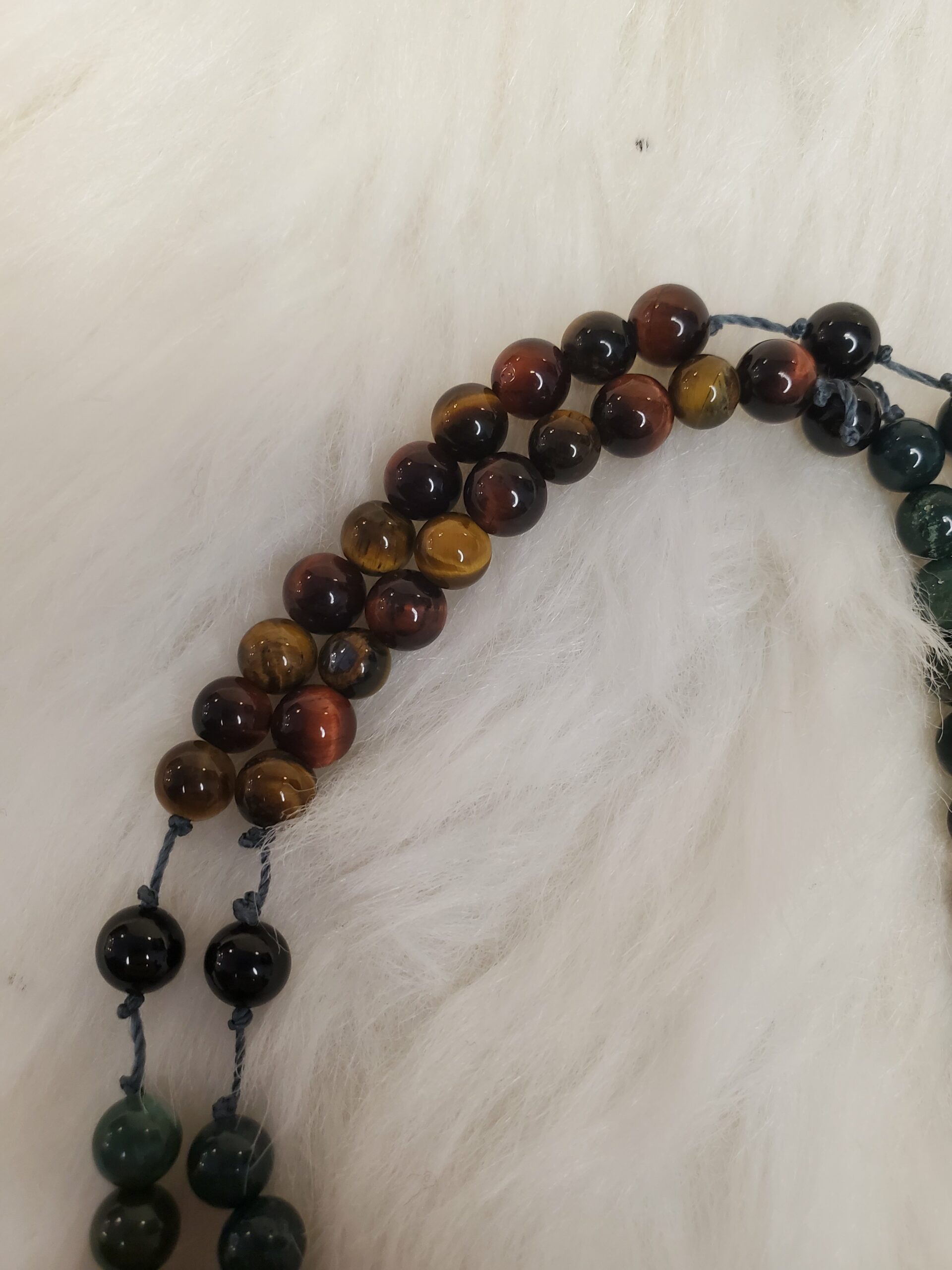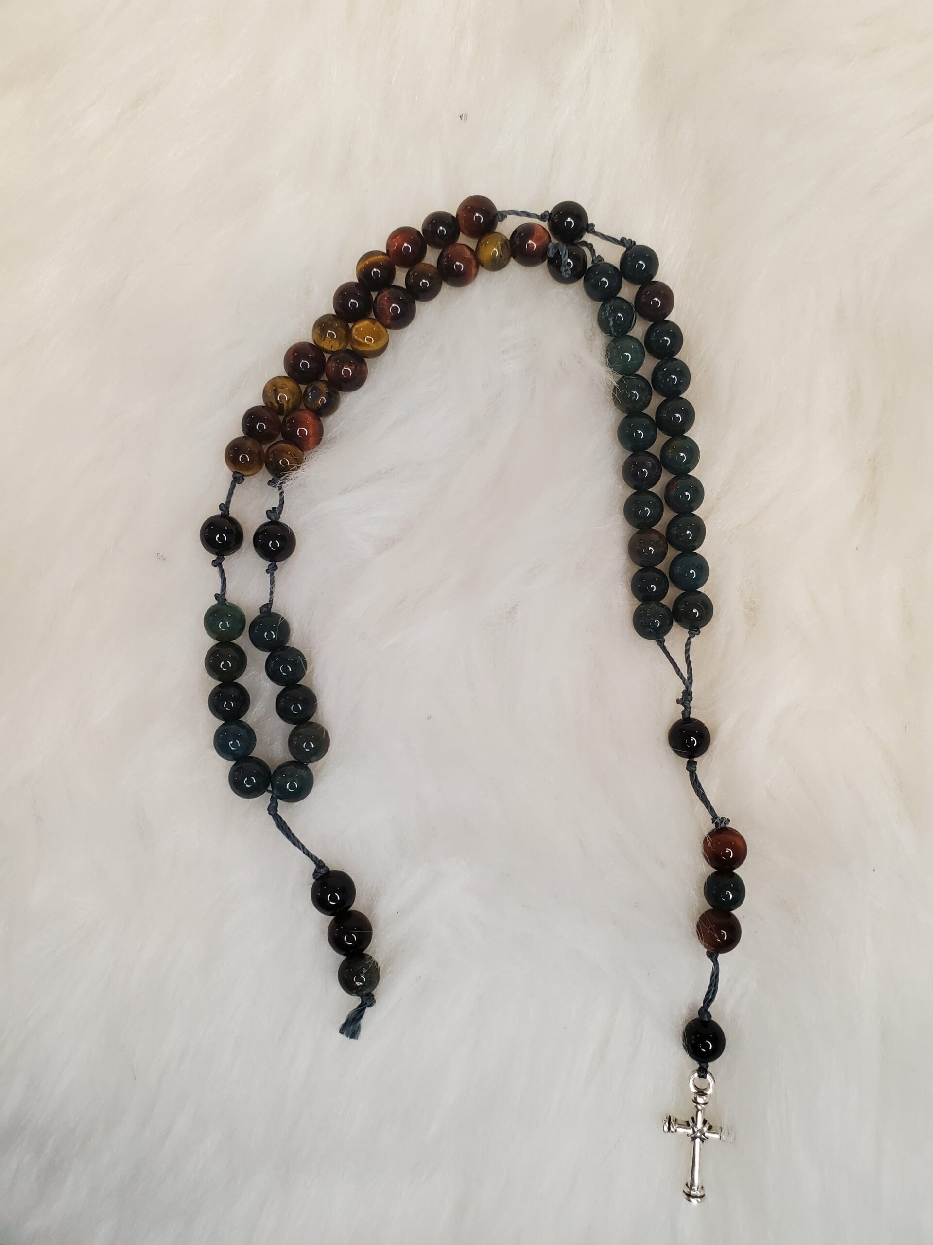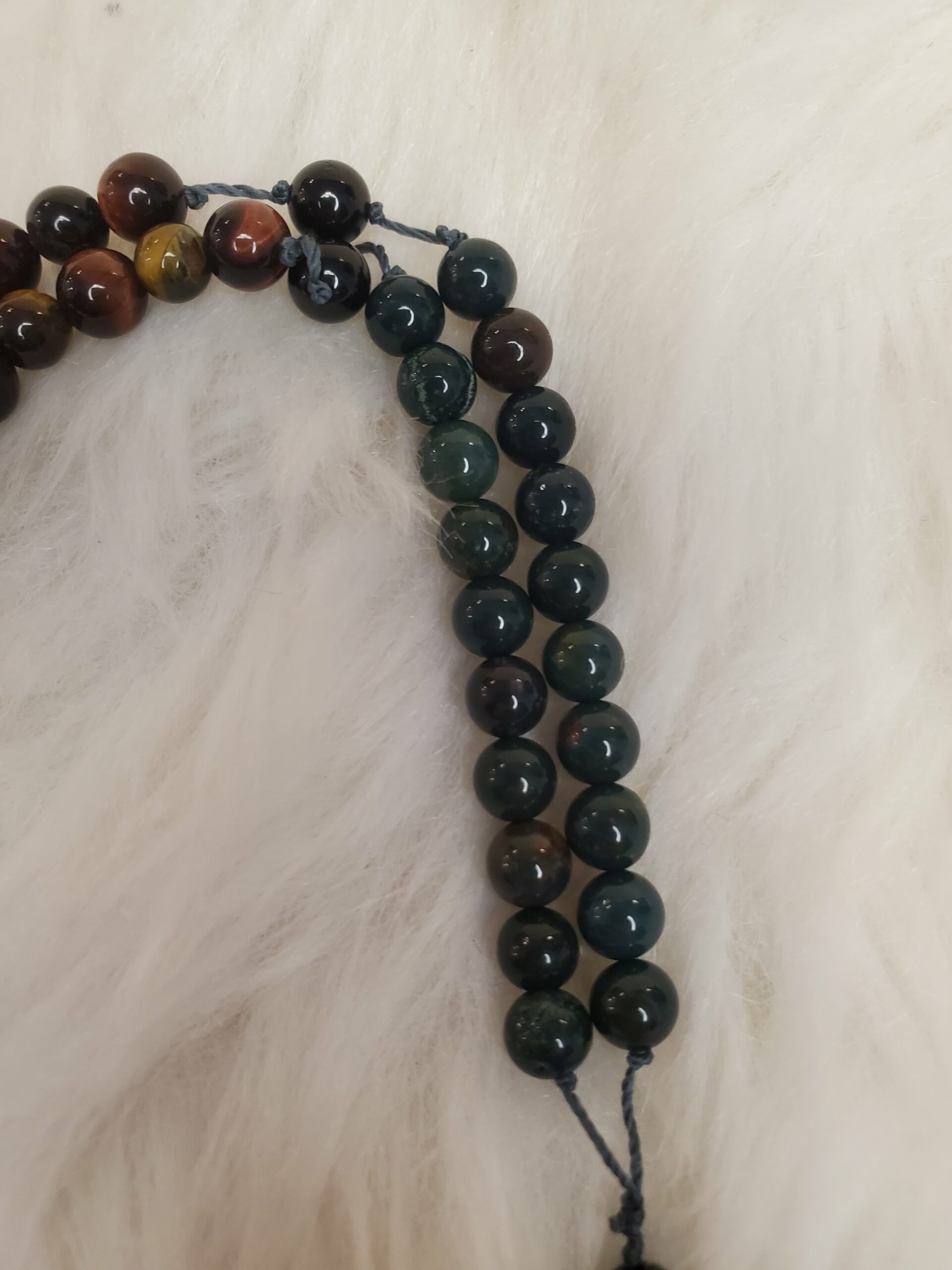 Chapelet en Œil de Tigre/Taureau, Héliotrope Sanguine et Tourmaline noire