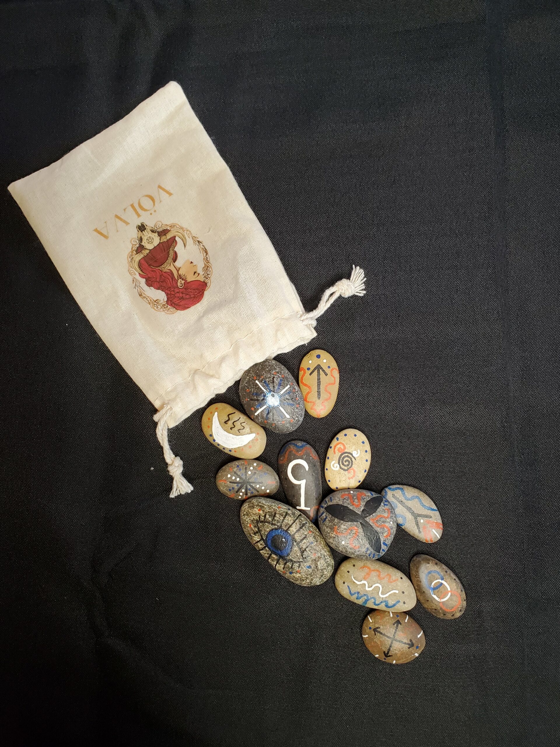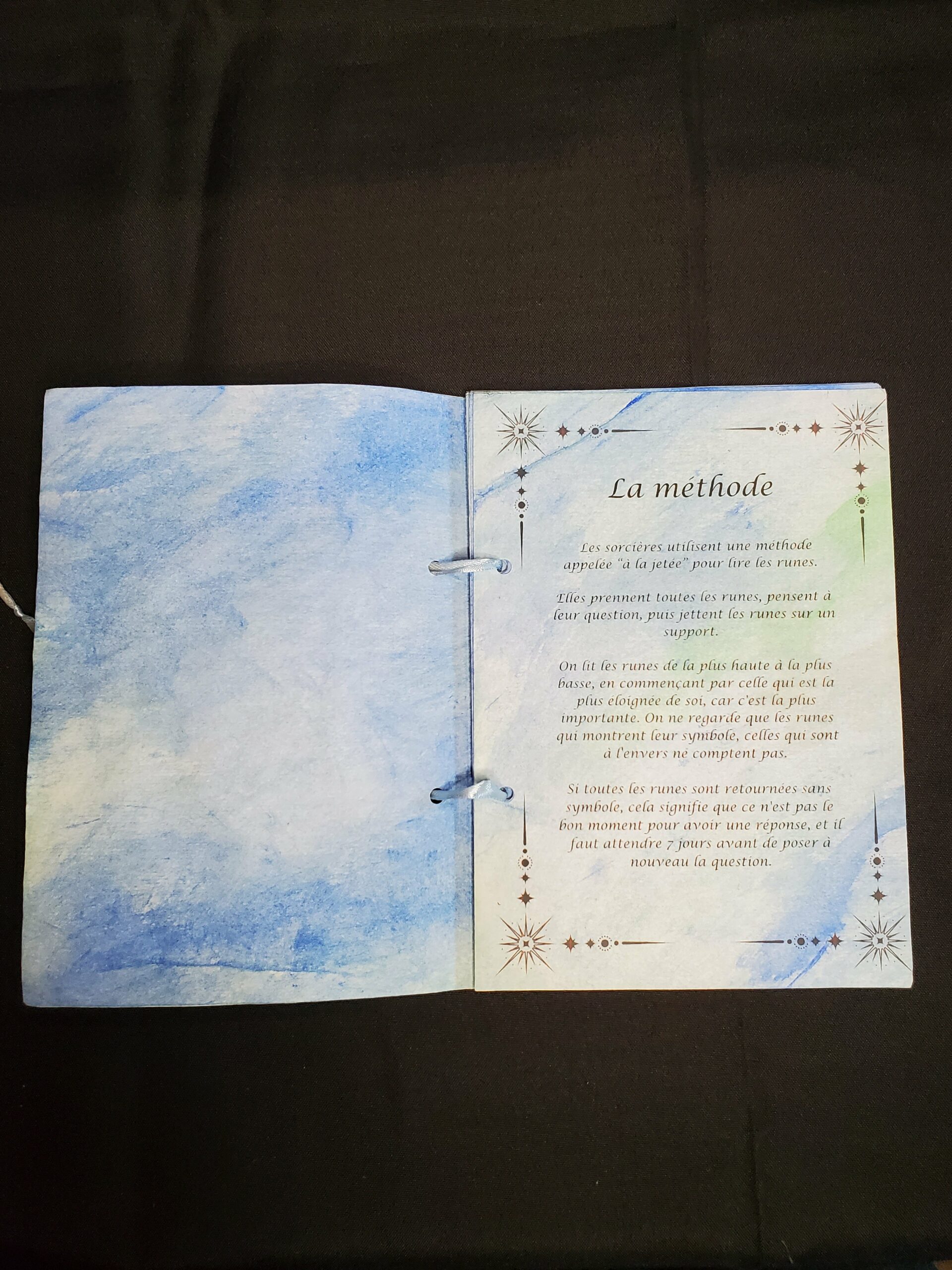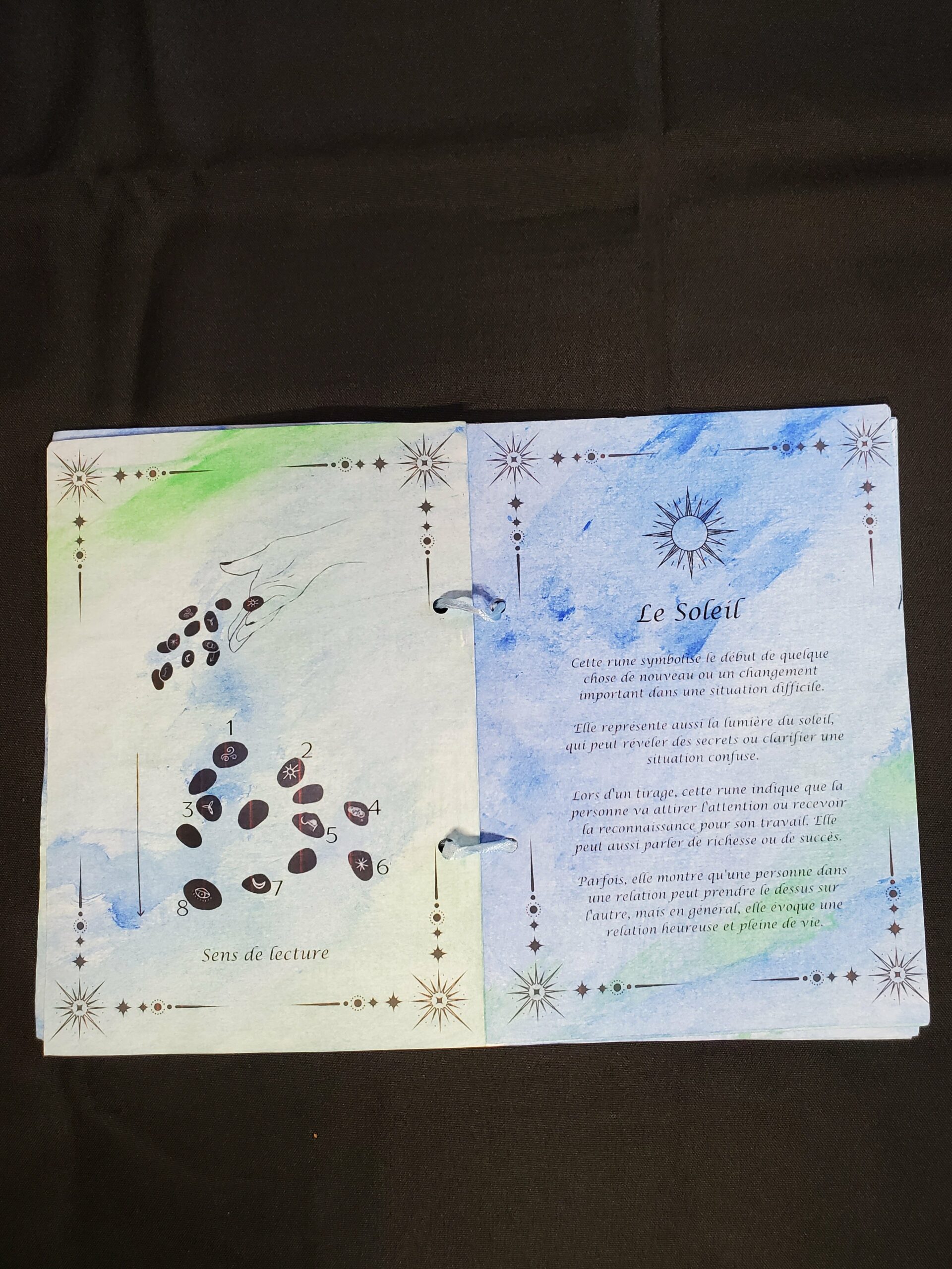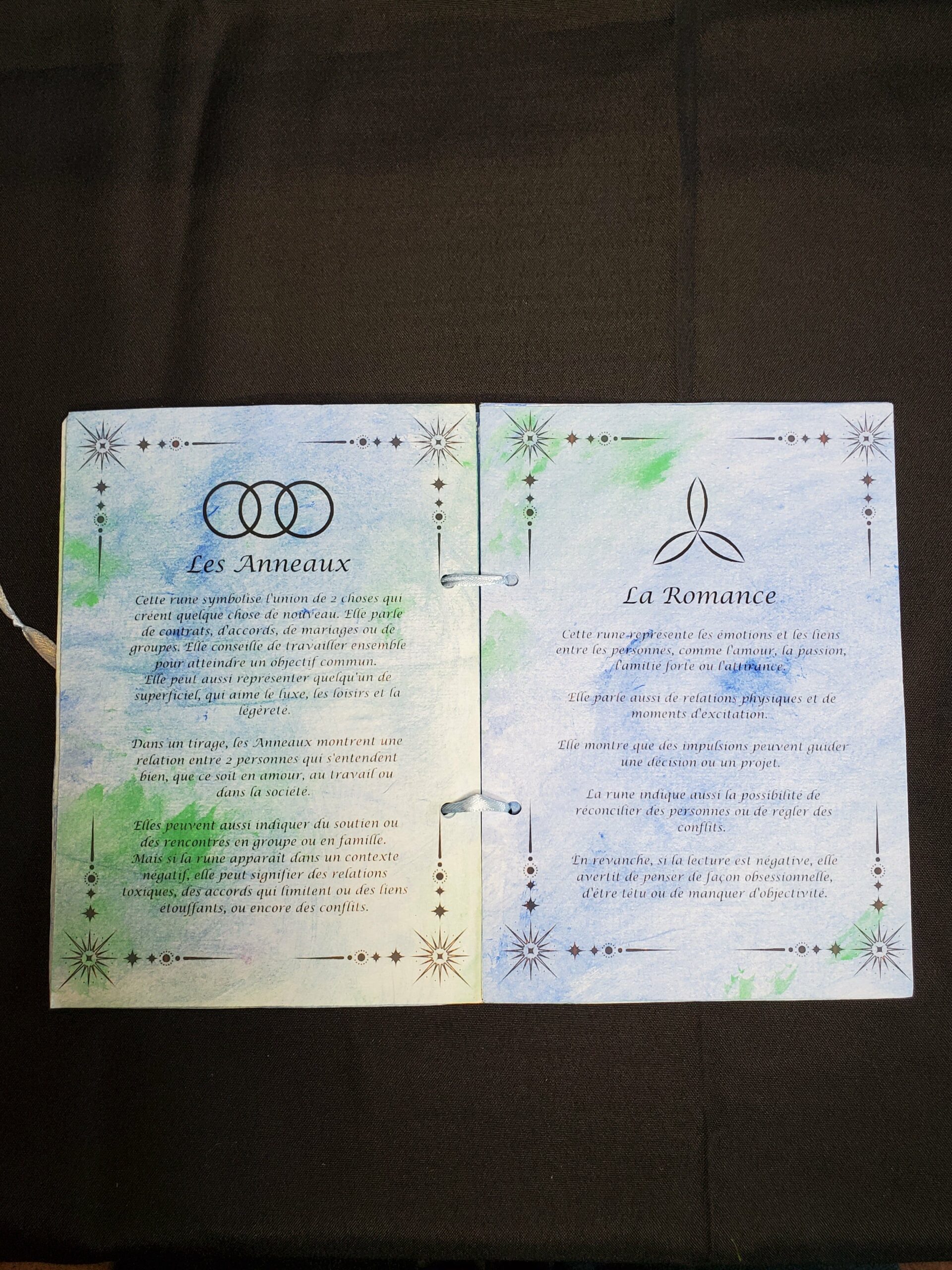 Ce jeu est vendu dans un pochon en coton et avec son livret explicatif fait entièrement par mes soins également. Vous y trouverez la méthode de tirage et la signification de chaques runes.