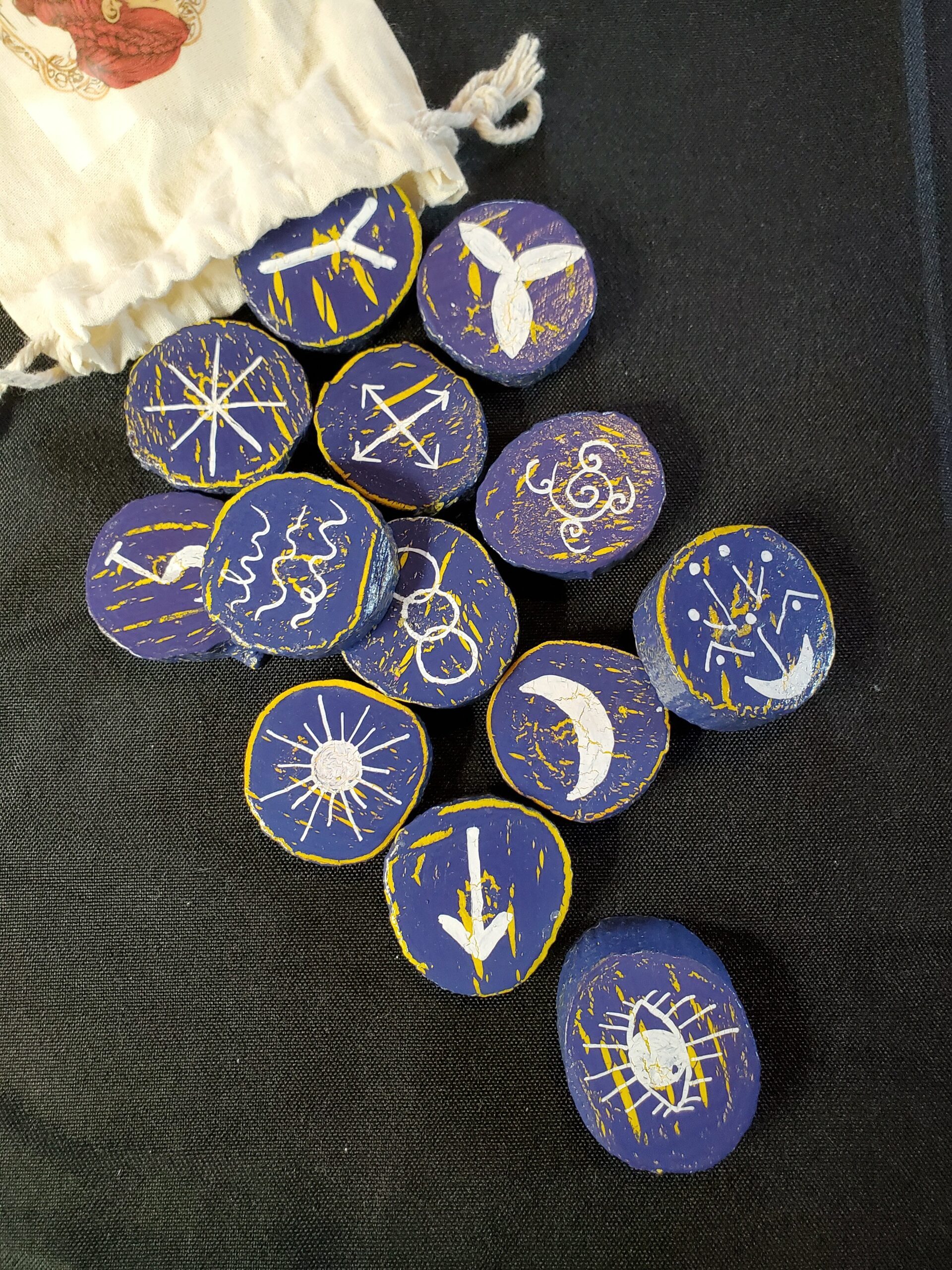 Ce jeu est vendu dans un pochon en coton et avec son livret explicatif fait entièrement par mes soins également. Vous y trouverez la méthode de tirage et la signification de chaques runes.