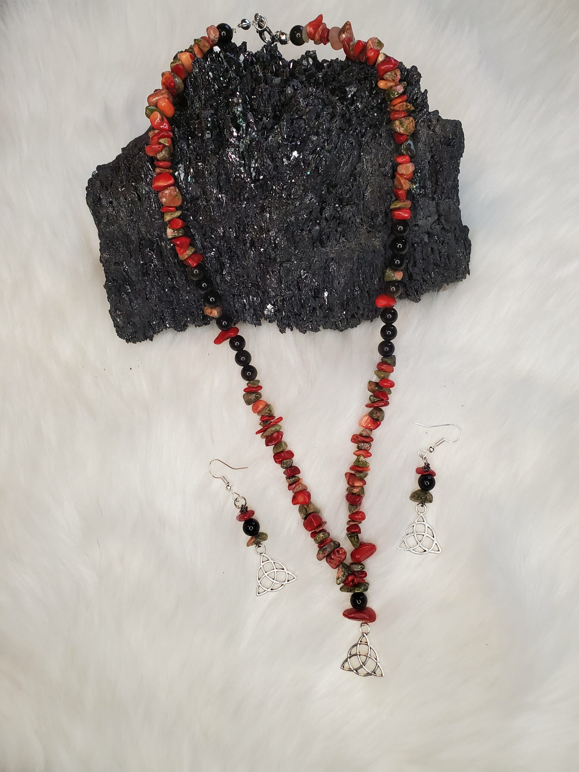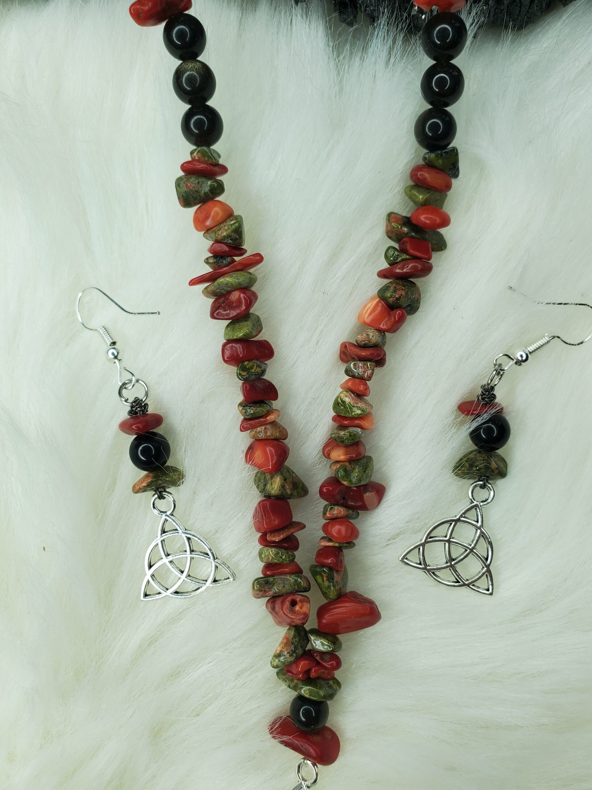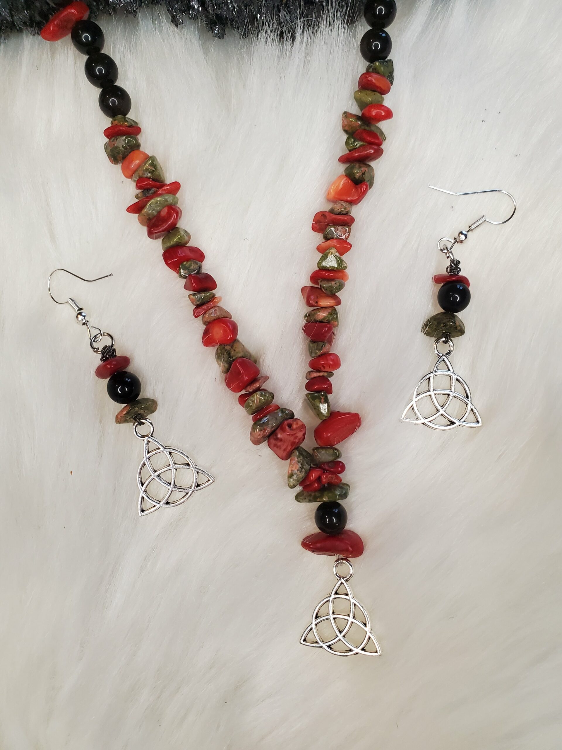 Parure faite en Corail, Unakite, Obsidienne dorée et Triquetra.