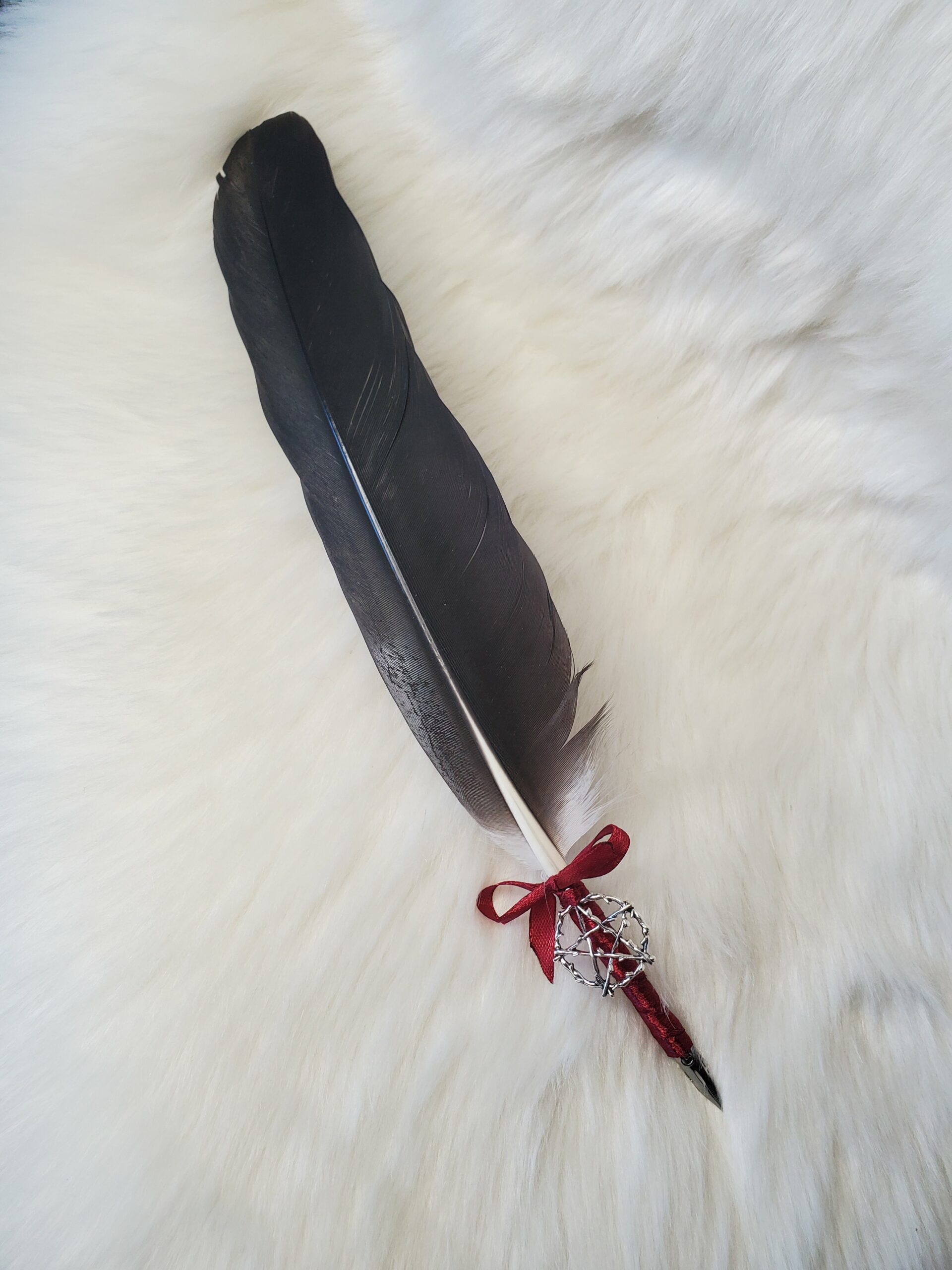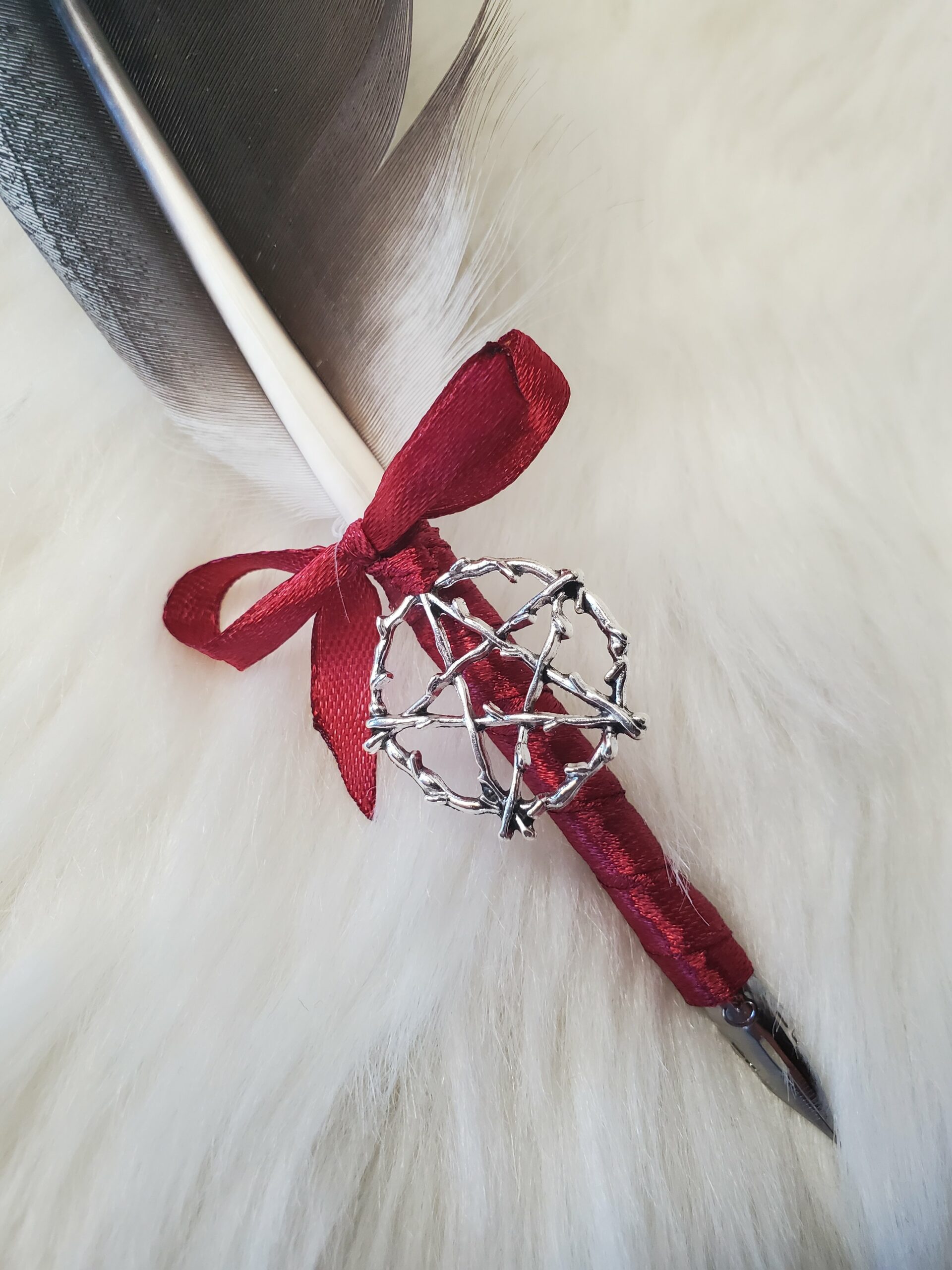 Elle est décorée d’un ruban bordeau et ornée d’un pentacle :