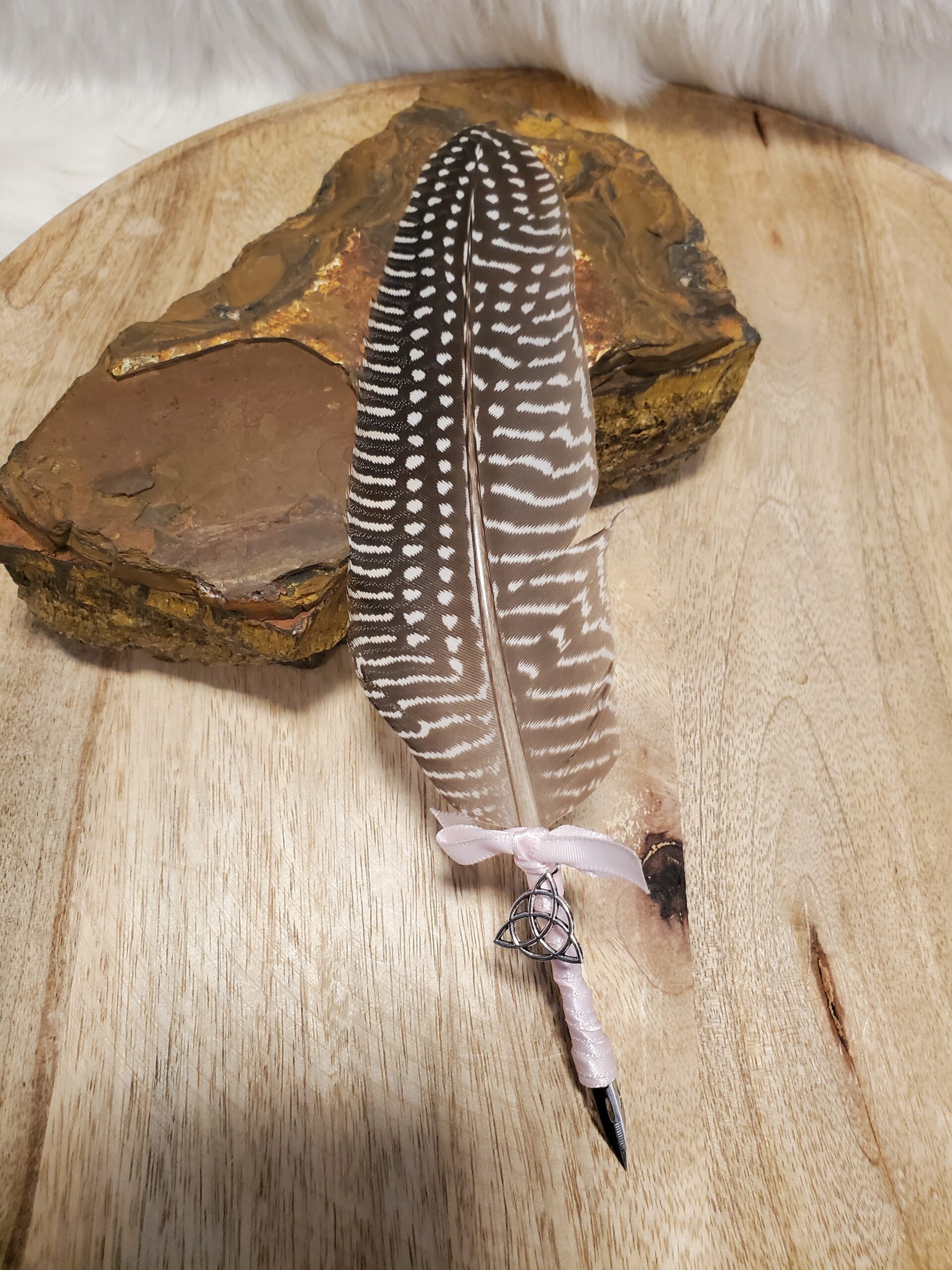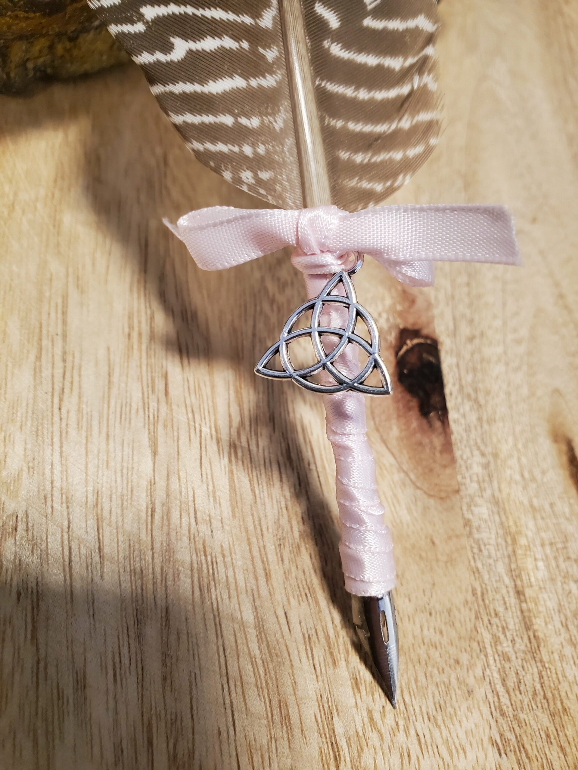 Elle est décorée d’un ruban violet lilas et ornée d’un Triquetra: