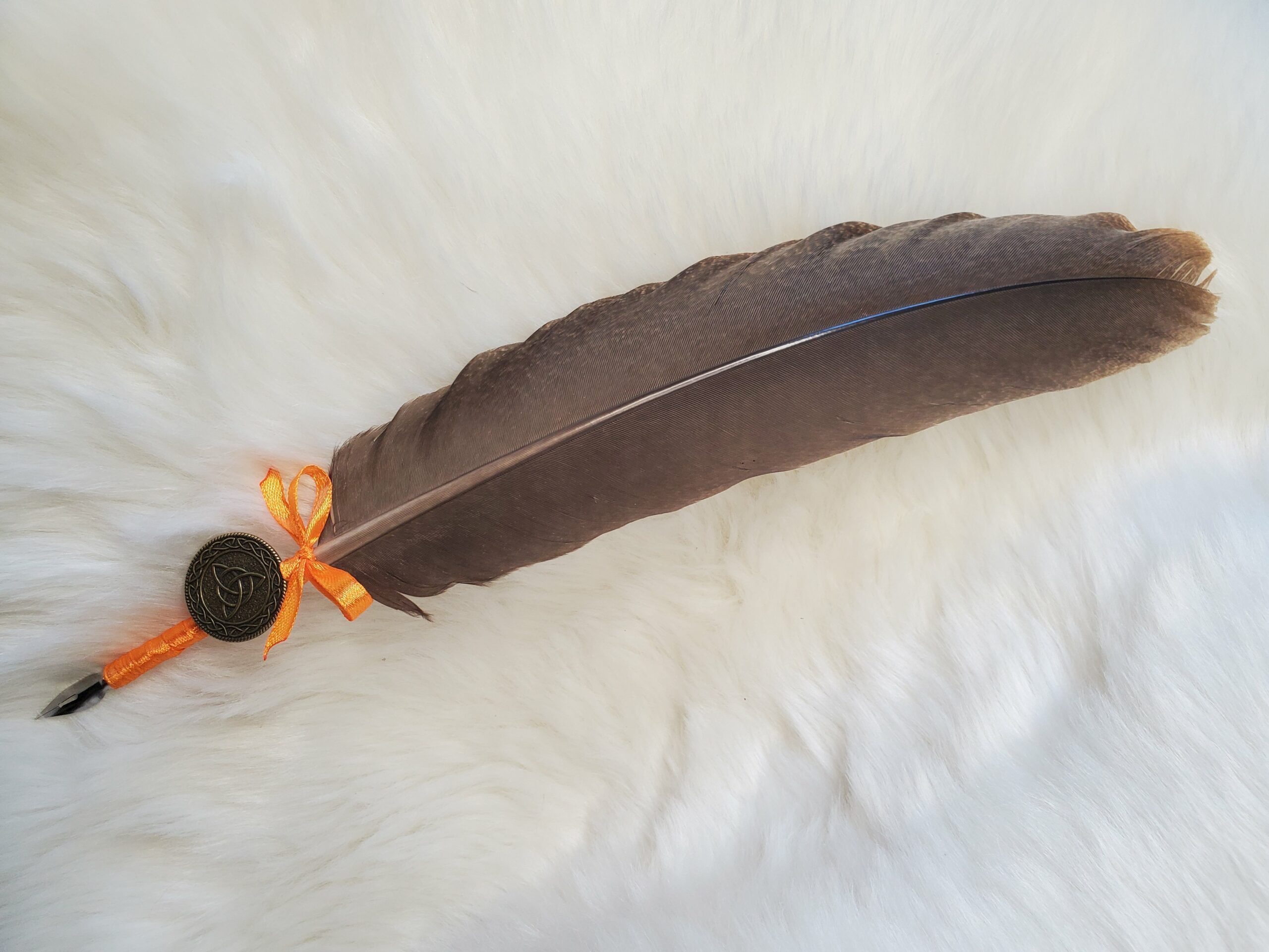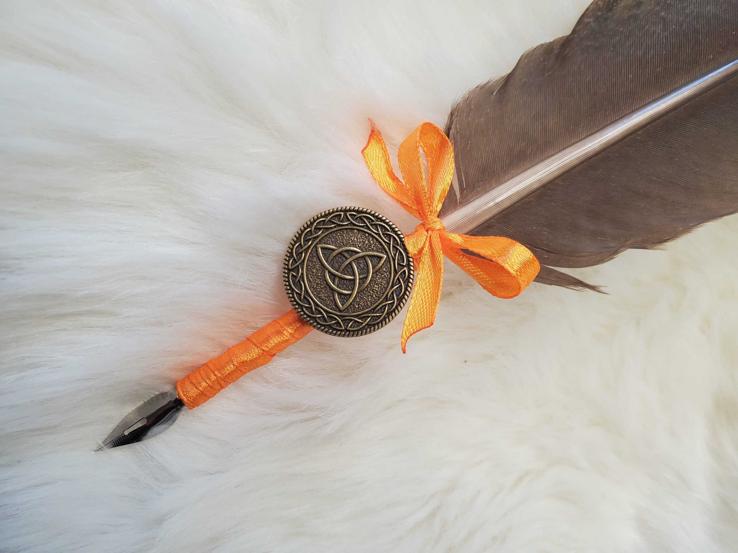 Elle est décorée d’un ruban orange et ornée d’un Triquetra: