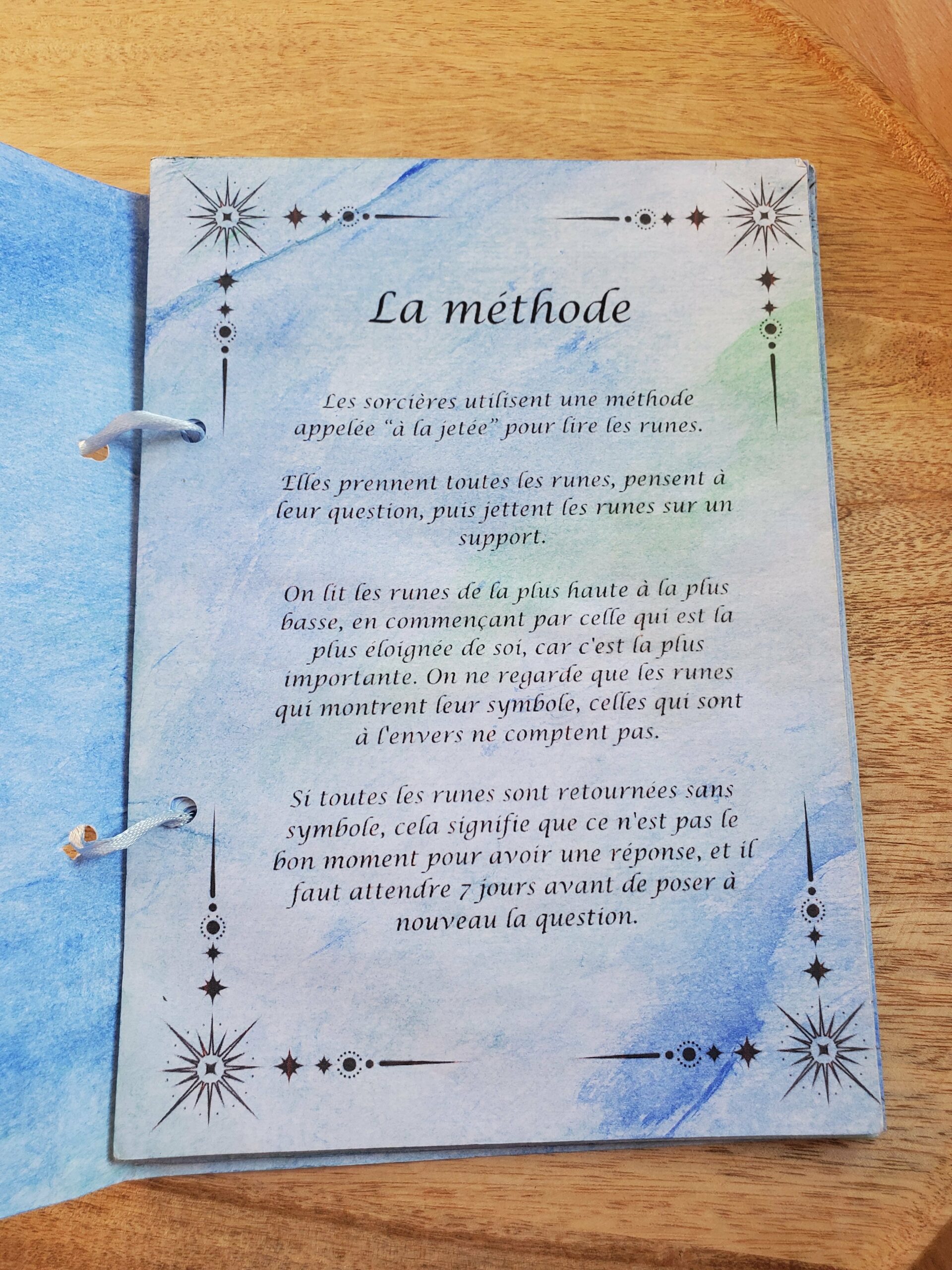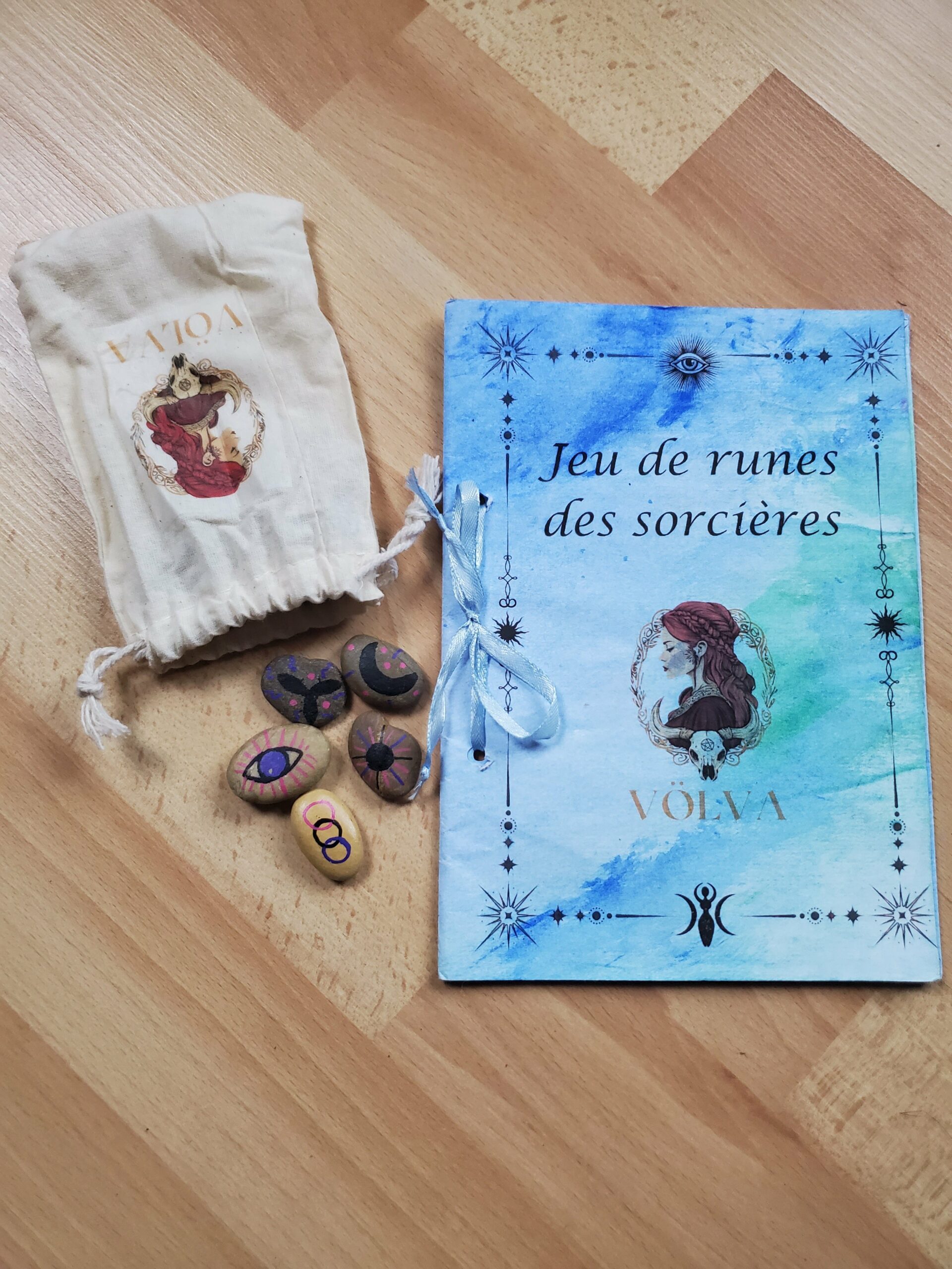 Ce jeu est vendu dans un pochon en coton et avec son livret explicatif fait entièrement par mes soins également. Vous y trouverez la méthode de tirage et la signification de chaques runes.