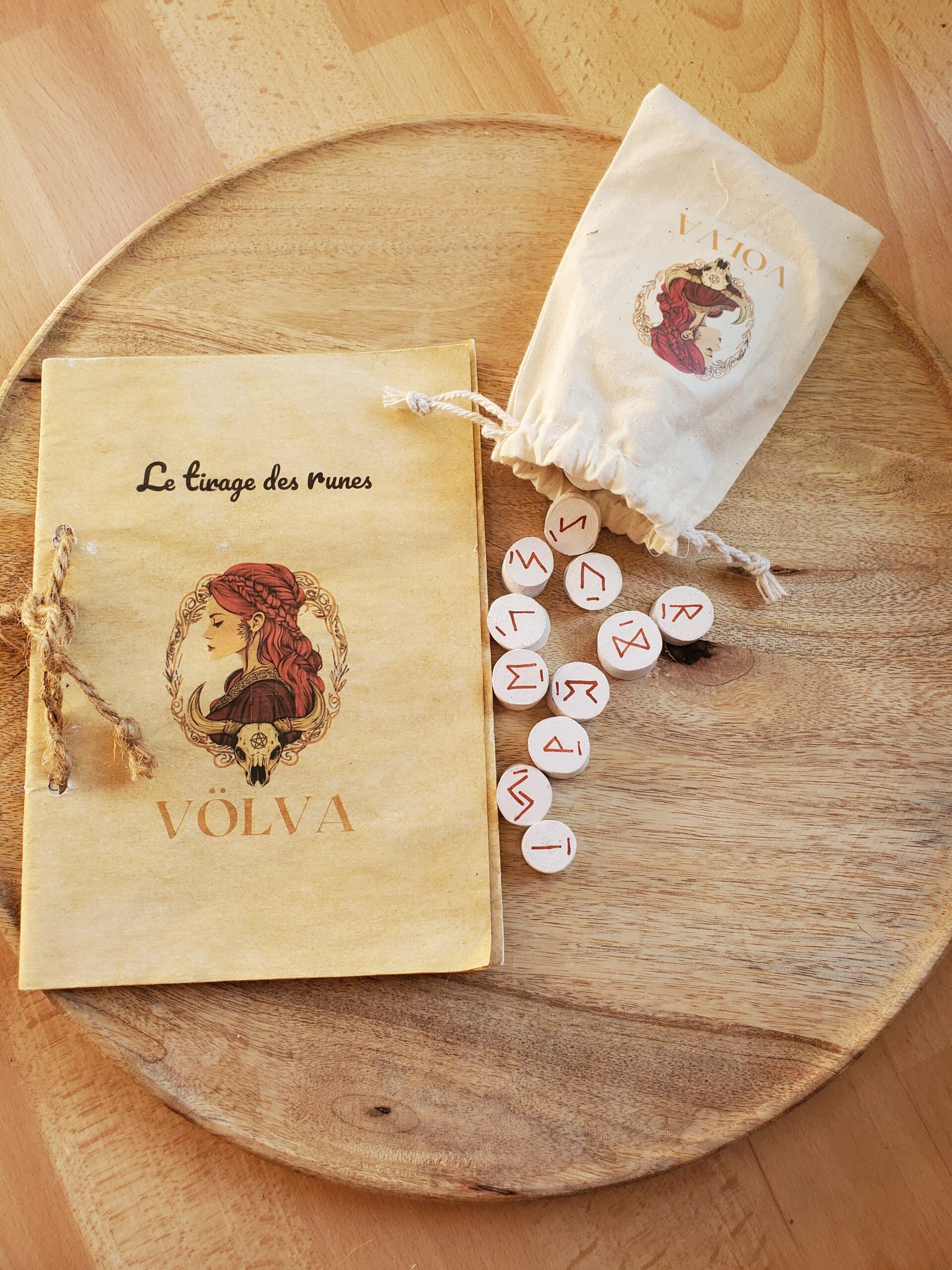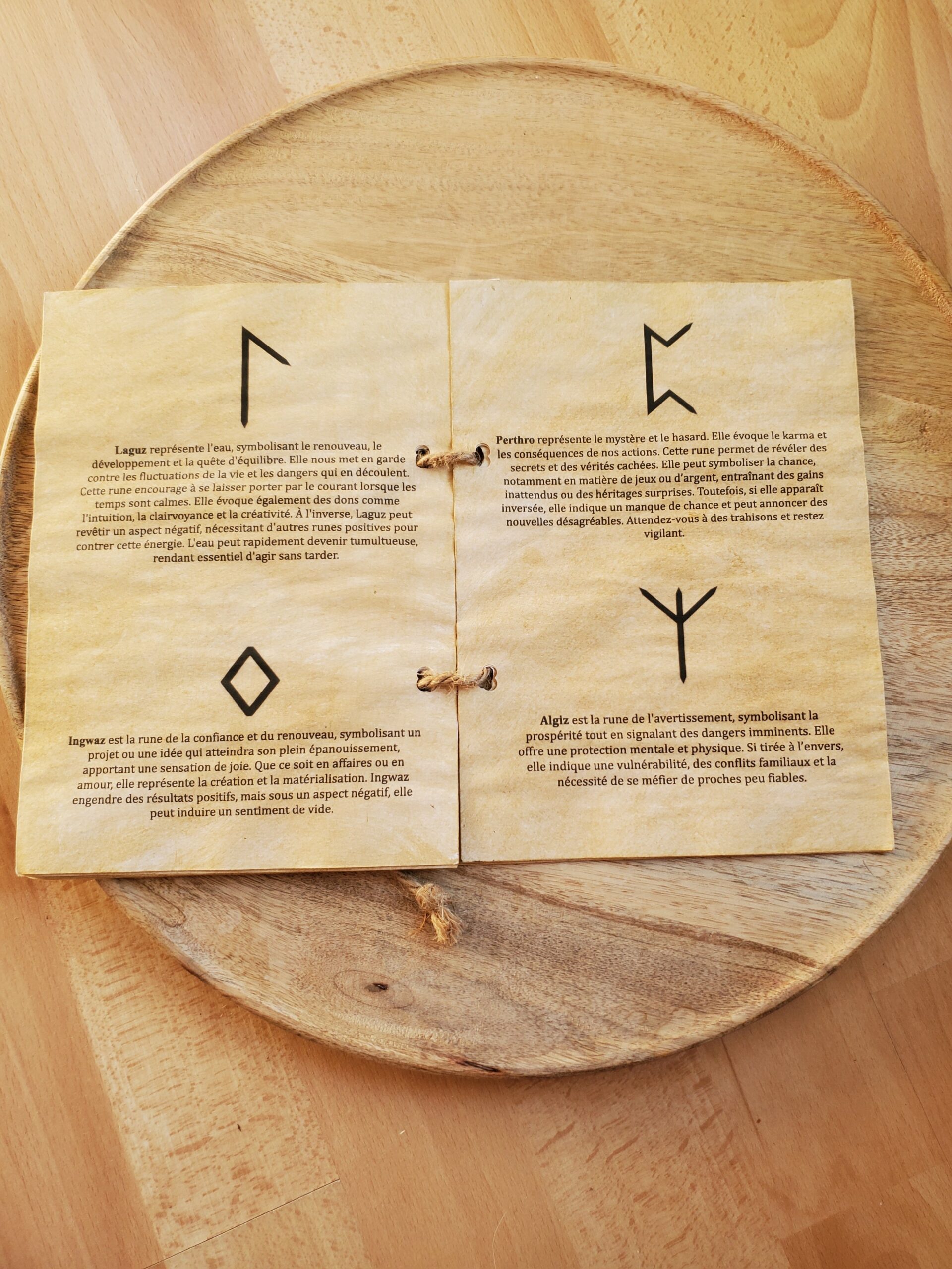 Ce jeu est vendu dans un pochon en coton et avec son livret explicatif fait entièrement par mes soins également. Vous y trouverez 3 types de tirages et la signification de chaques runes.