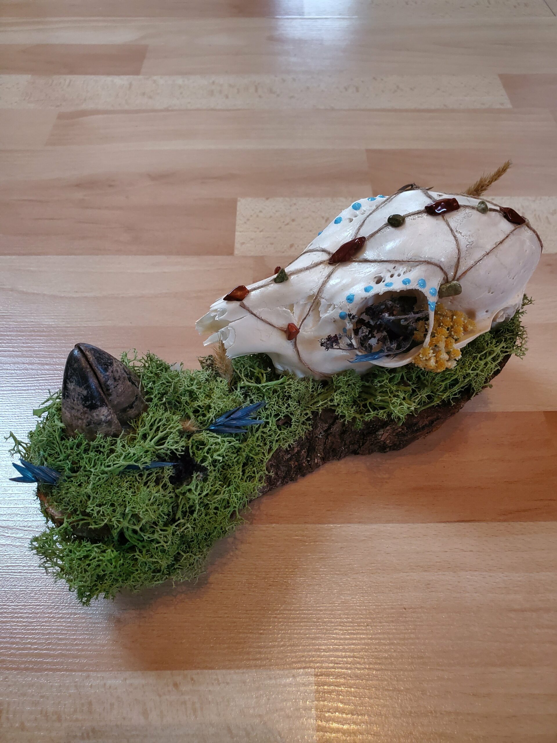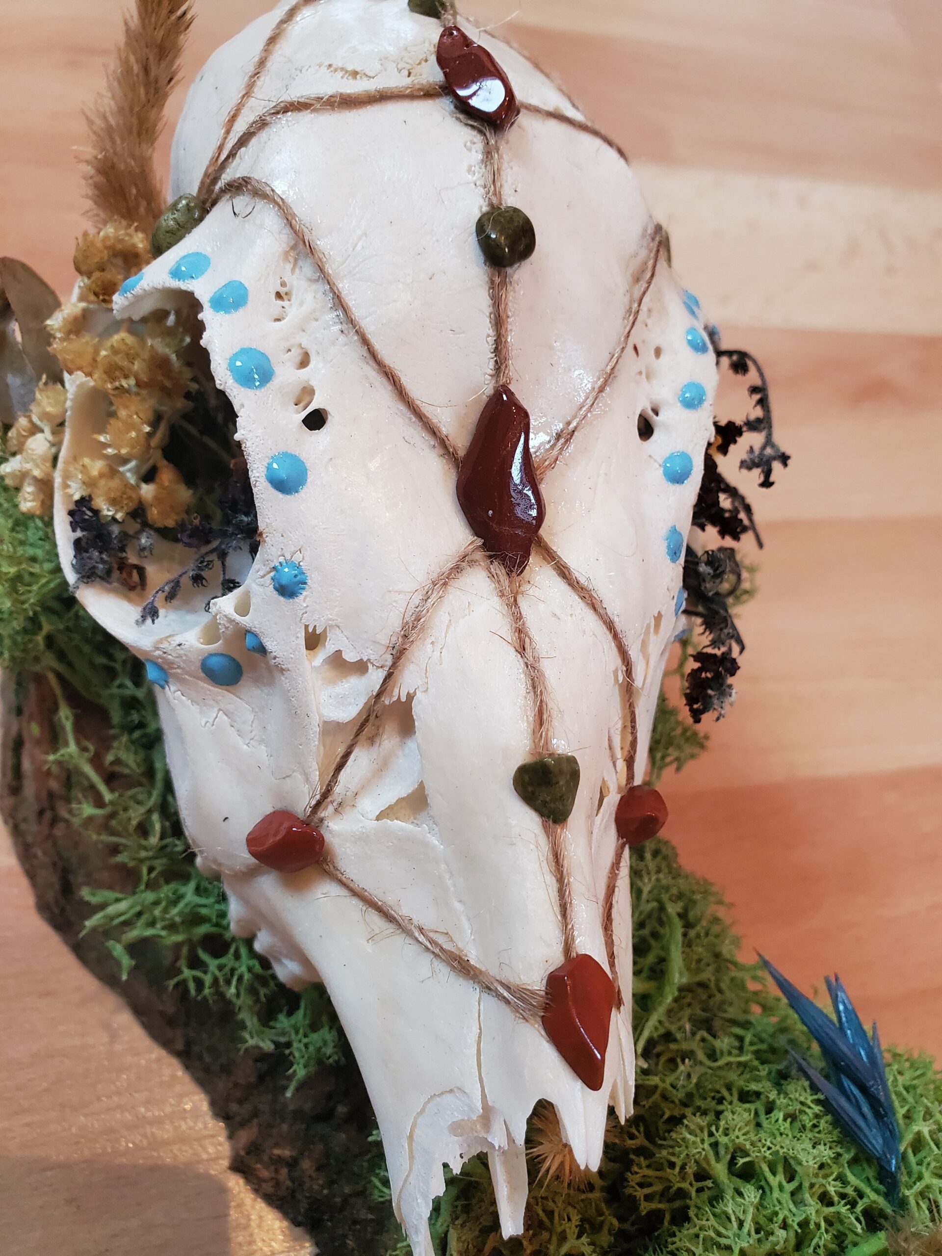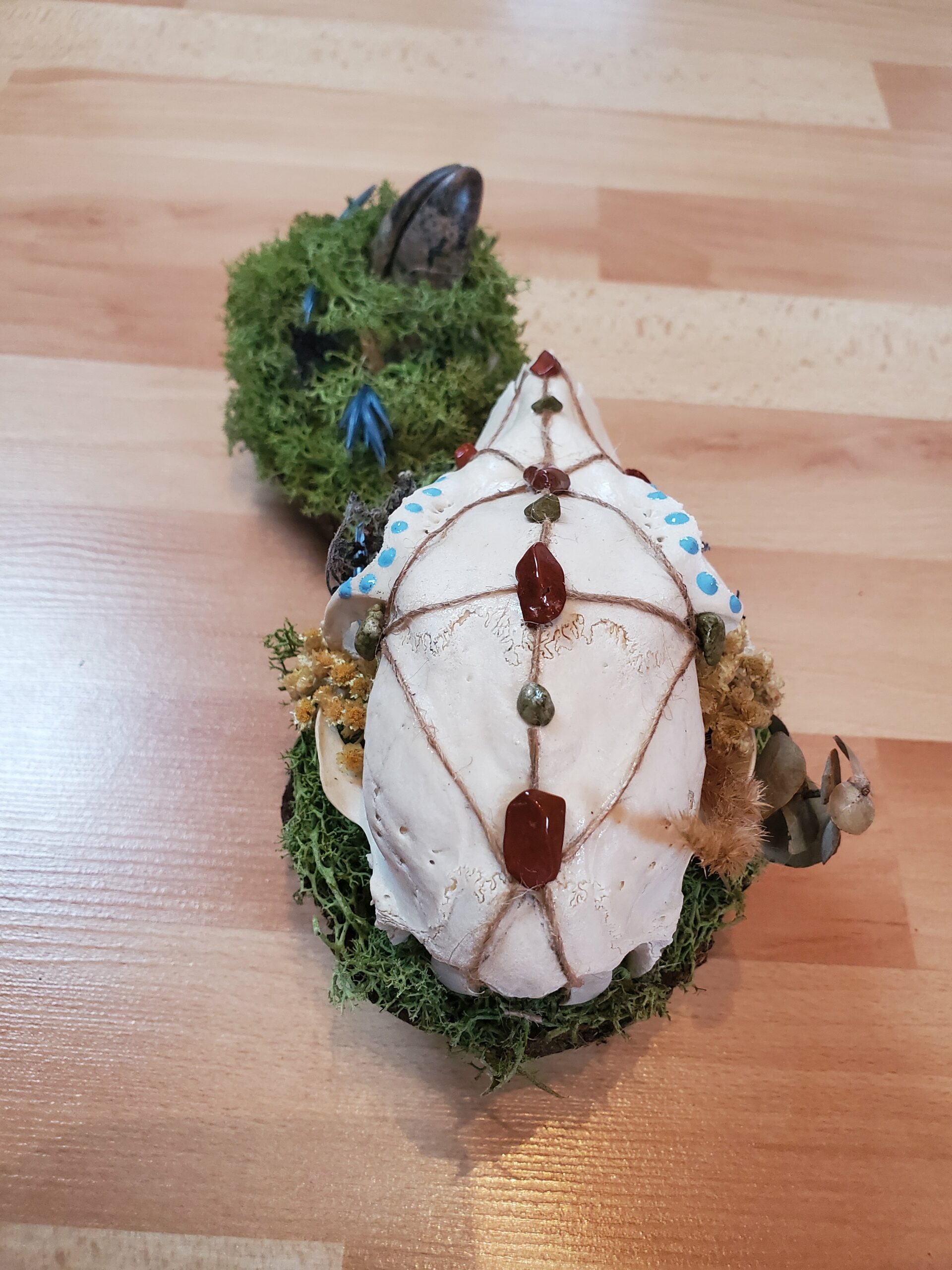 Crâne orné de Jaspe rouge, de Serpentine et de fleurs séchées.