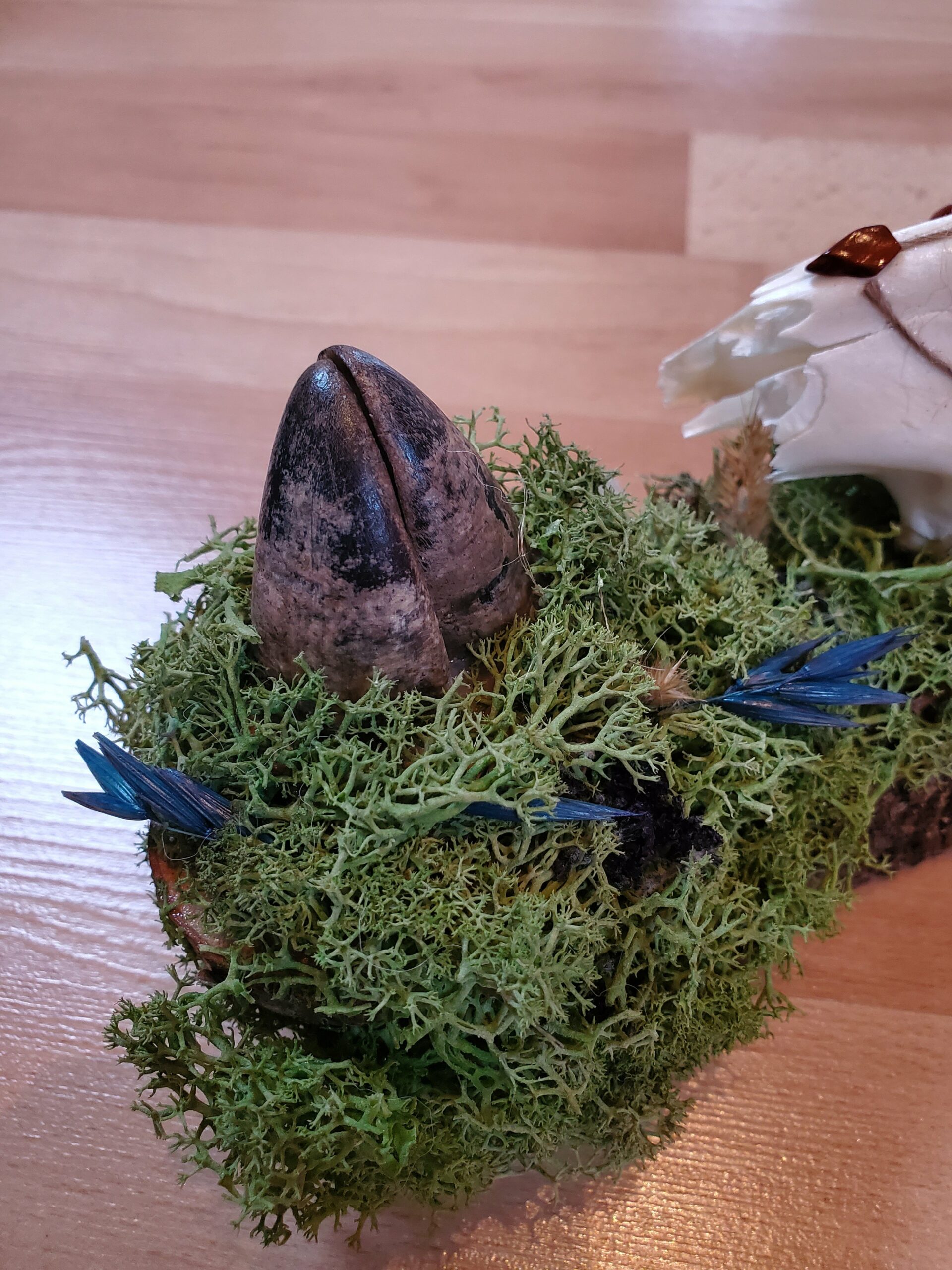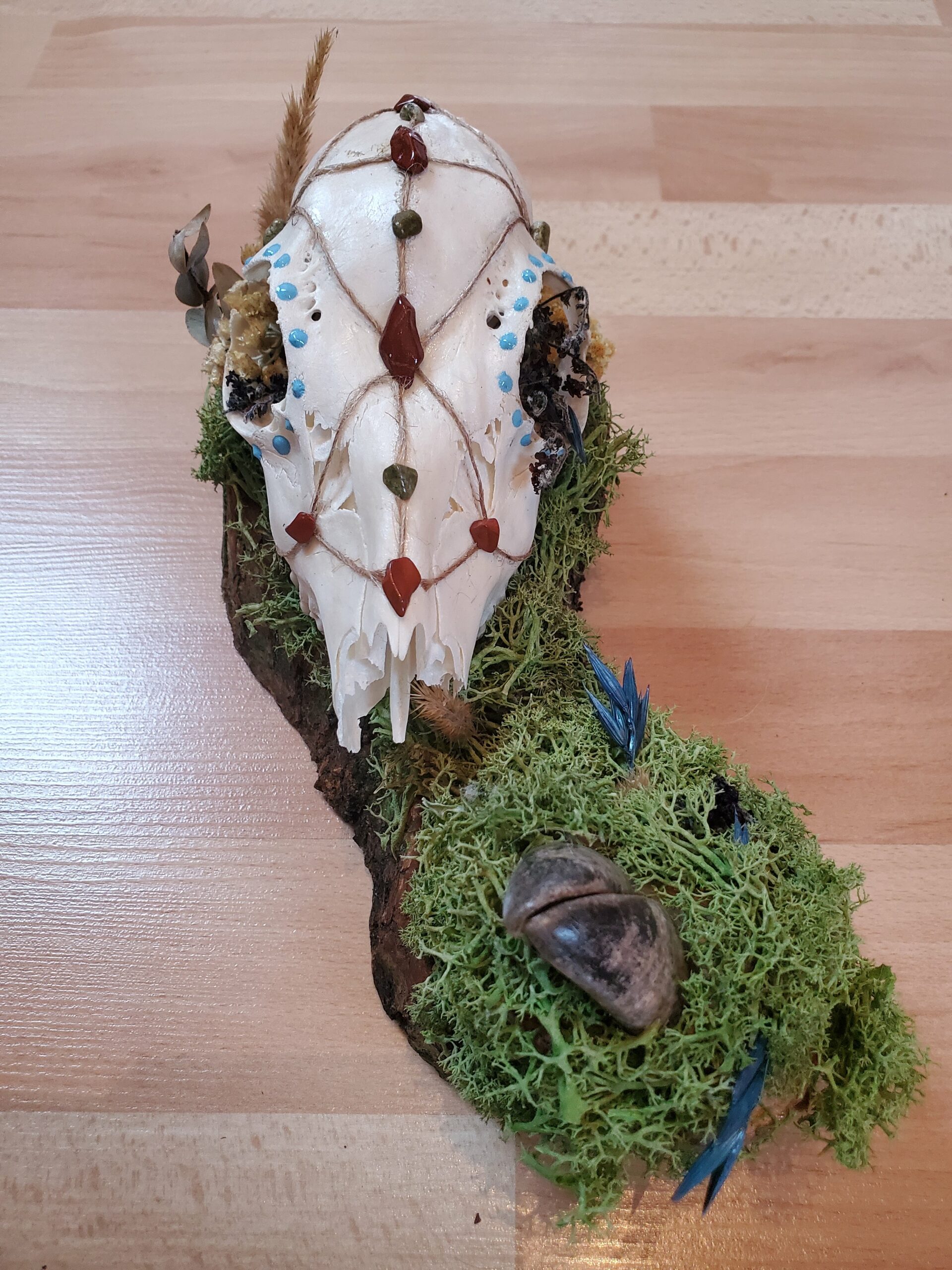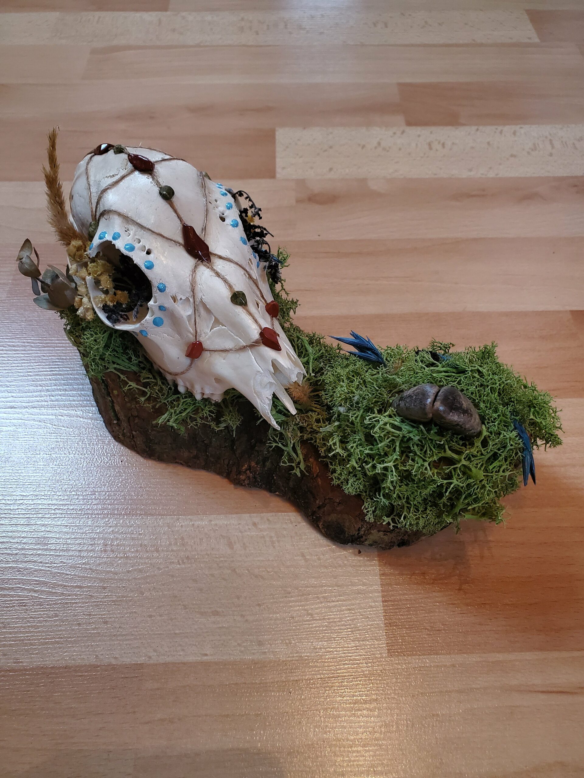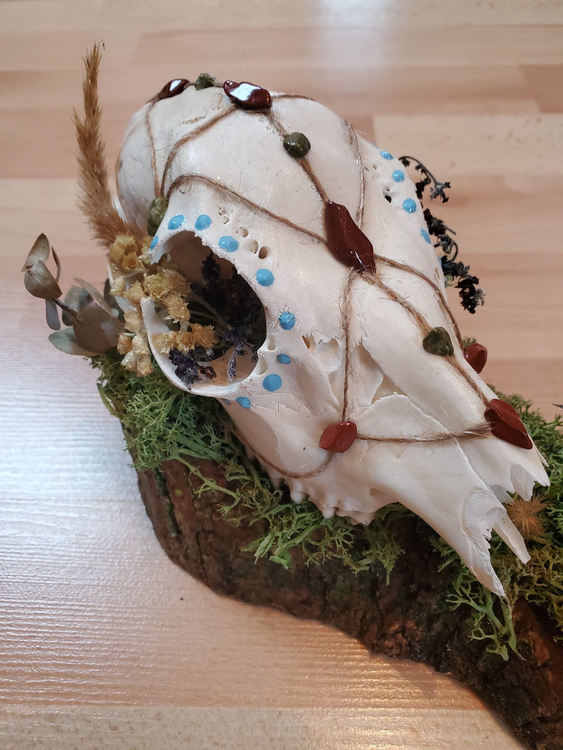 Crâne orné de Jaspe rouge, de Serpentine et de fleurs séchées.