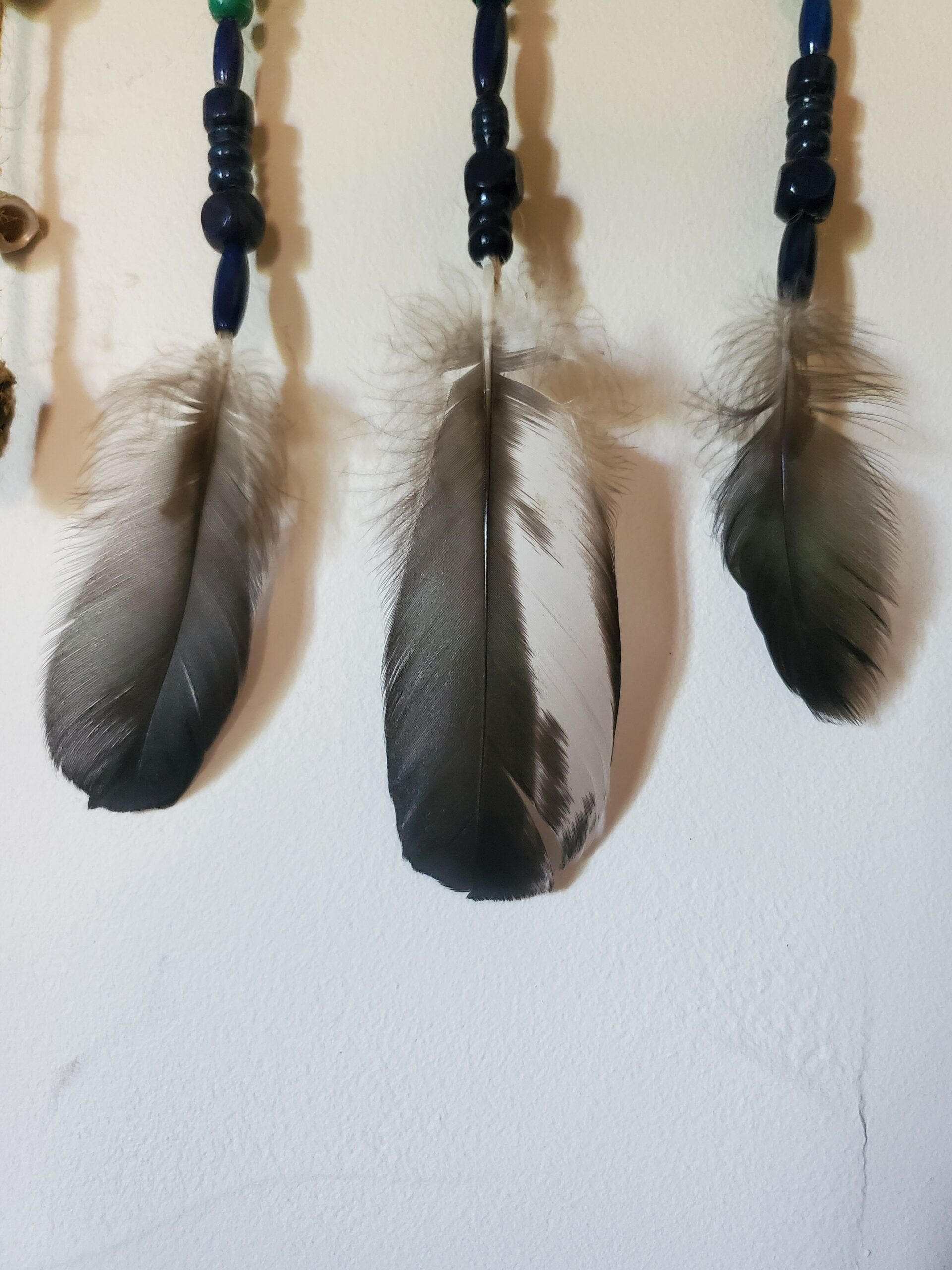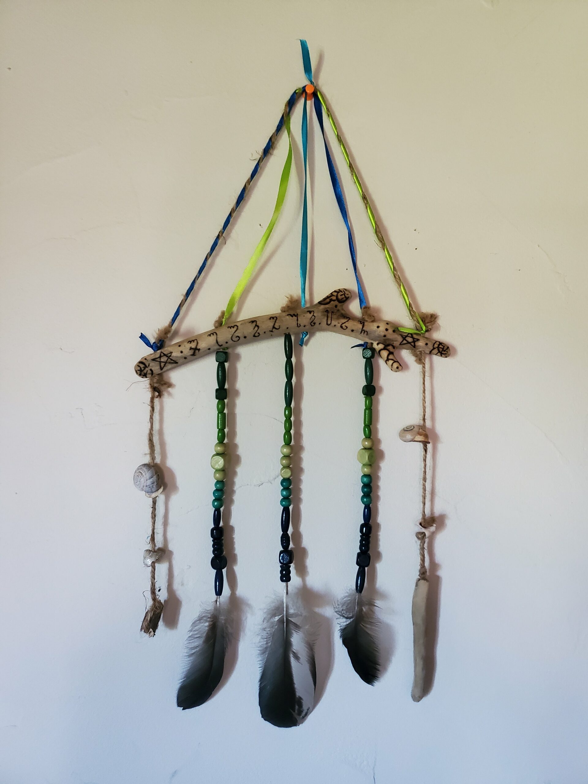 » La protection de la sorcière » est un totem de protection fait à partir de bois flotté gravé auquel sont fixées des cordelettes ornées de plumes de canards, de perles en bois et des coquillages.